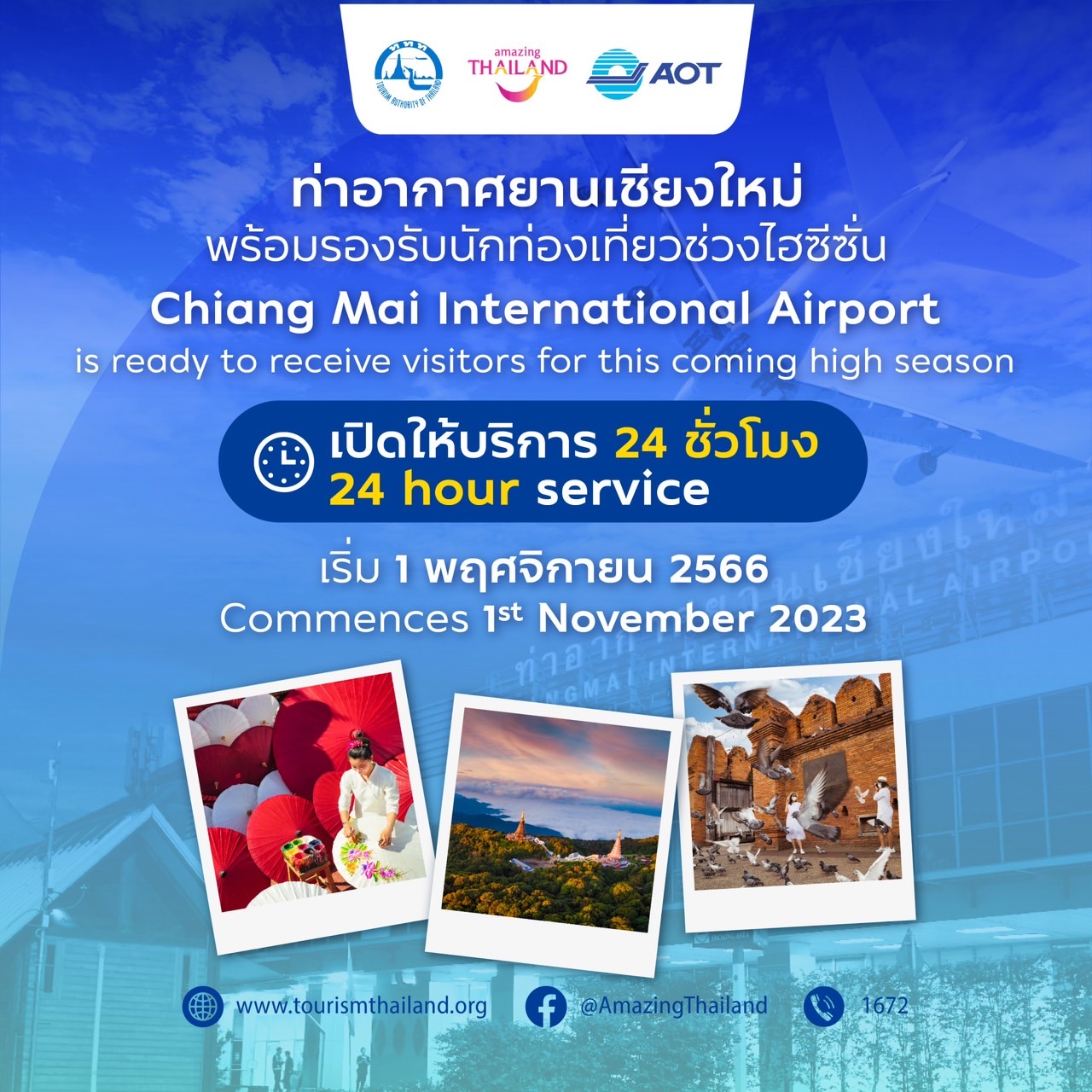 ท่าอากาศยานเชียงใหม่ เตรียมพร้อมรองรับนักท่องเที่ยวช่วงไฮซีซั่นเปิดตลอด 24 ชั่วโมง ตั้งแต่วันที่ 1 พฤศจิกายน 2566 เป็นต้นไป จากเดิมเปิดดำเนินการเวลา 06.00 – 24.00 น. ได้เพิ่มการรองรับนักท่องเที่ยว และเที่ยวบินที่จะเดินทางมายังจังหวัดเชียงใหม่ รวมถึงรองรับเที่ยวบินระยะกลางหรือระยะไกล ที่ใช้เวลาบินออกจากท่าอากาศยานเชียงใหม่หลังเวลา 24.00 น. เพื่อไปถึงประเทศปลายทางในตอนเช้า และเป็นการเพิ่มตารางการบิน (Slot) ให้สายการบินสามารถจัดตารางการบินเพิ่มได้ด้วย