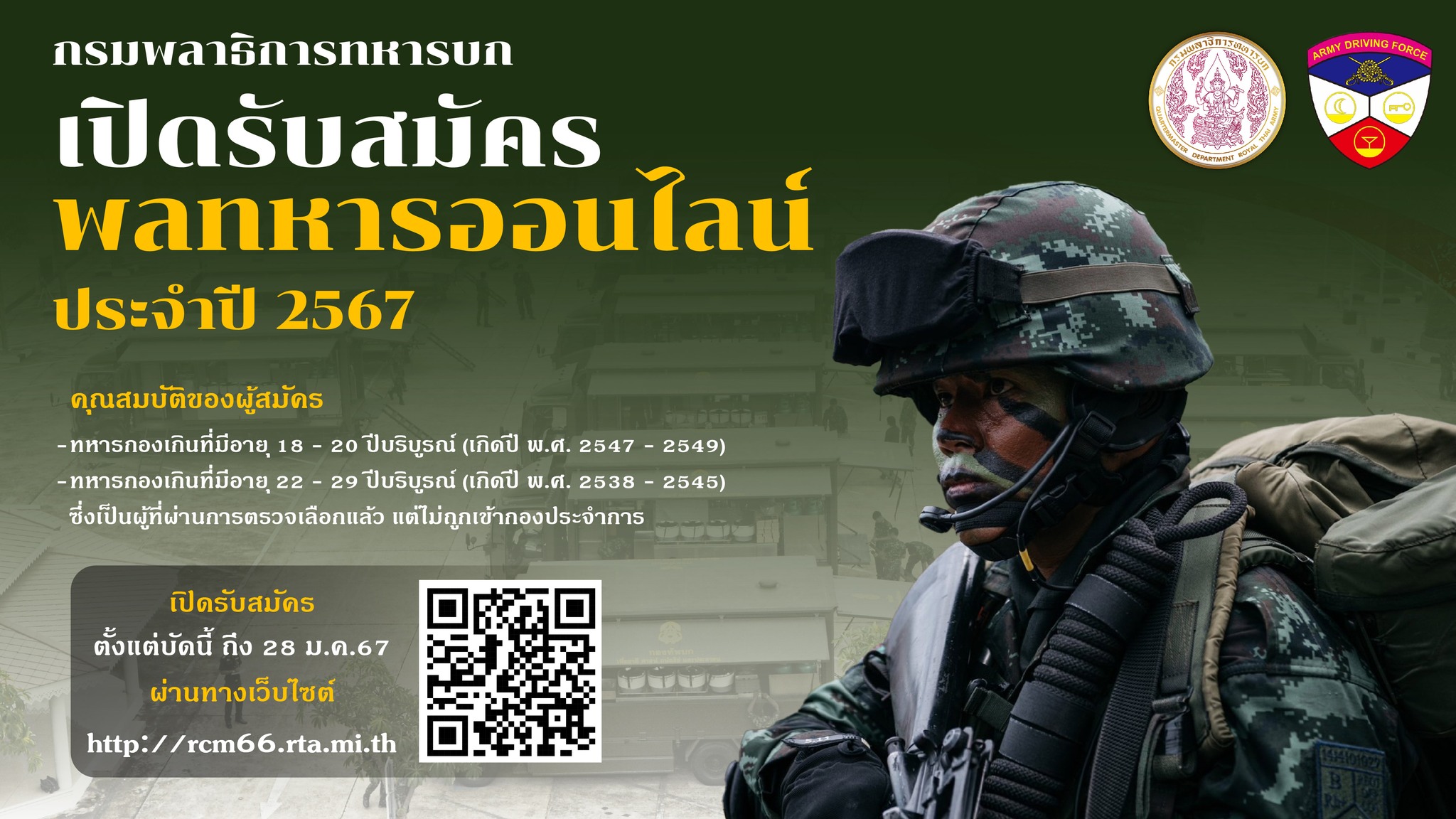 กองทับบก เปิดรับสมัครพลทหารออนไลน์ ประจำปี 2567 สมัครได้ตั้งแต่บัดนี้จนถึง 28 มกราคม 2567