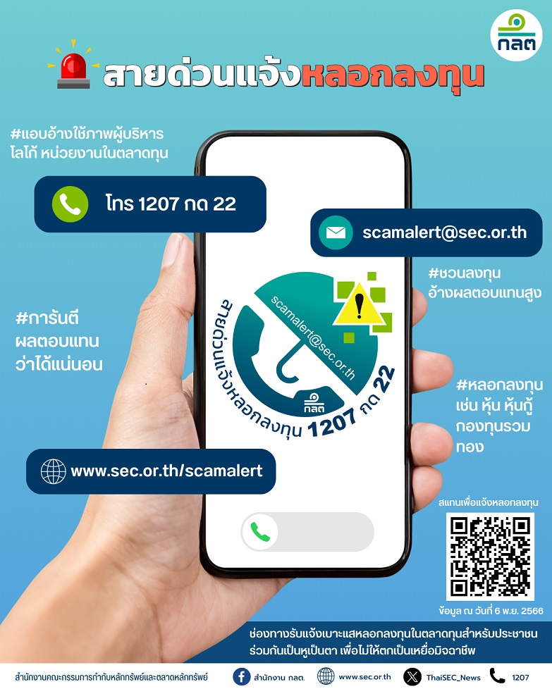 ก.ล.ต. เปิดให้บริการ “สายด่วนแจ้งหลอกลงทุน” ช่วยเหลือประชาชนไม่ให้ตกเป็นเหยื่อมิจฉาชีพ