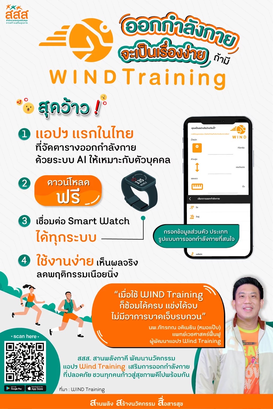 สำนักงานกองทุนสนับสนุนการสร้างเสริมสุขภาพ แนะนำการออกกำลังกายจะเป็นเรื่องง่าย แค่มี WIND Training แอปฯ แรกในไทย ที่จัดตารางออกกำลังกายด้วยระบบ AI ให้เหมาะสมกับตัวคุณ