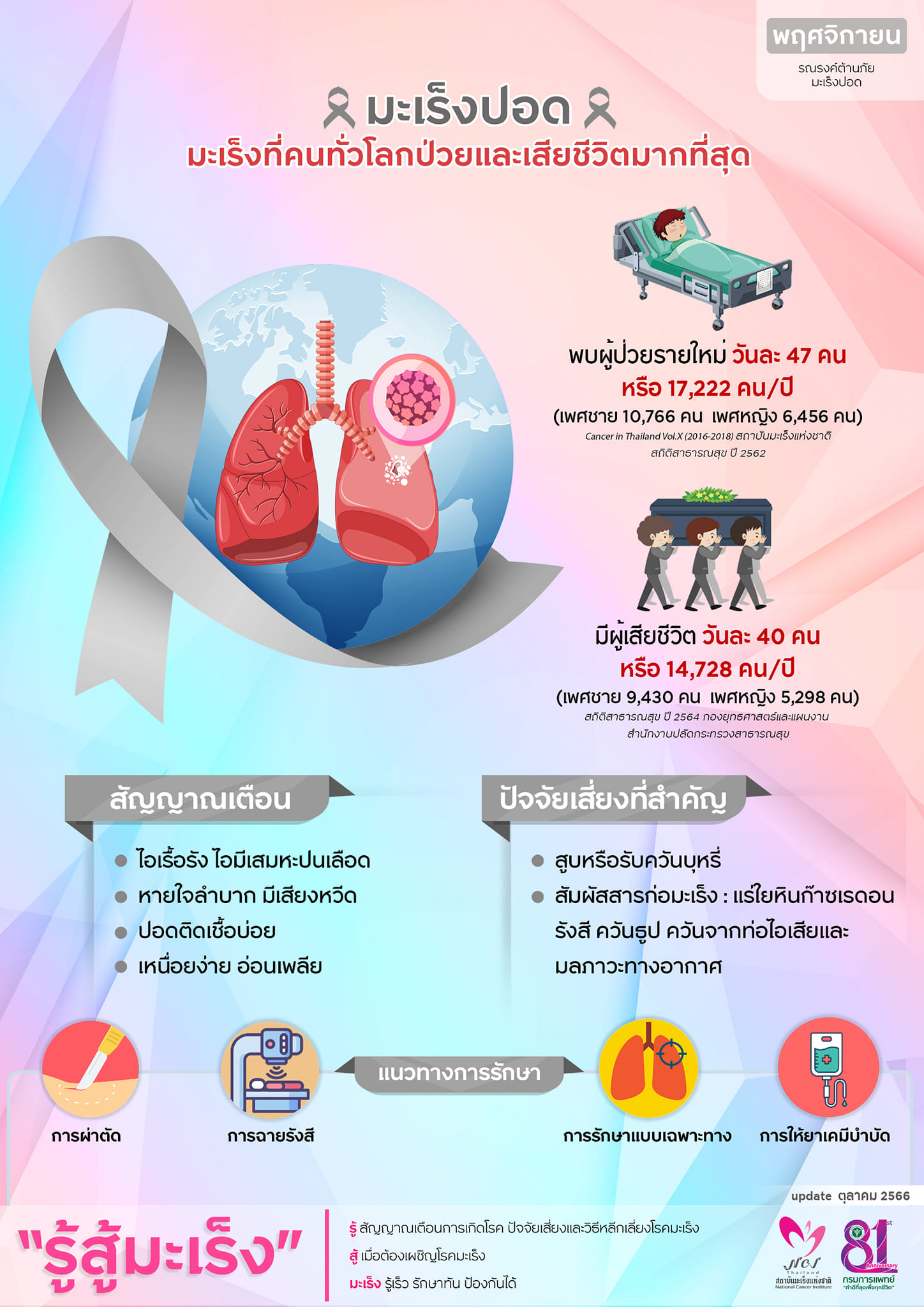 พฤศจิกายนเดือนแห่งการรณรงค์ต้านภัยมะเร็งปอด กรมการแพทย์ขอเชิญชวนท่านชายและหญิงทุกช่วงวัย ตระหนักถึงภัยร้ายของมะเร็งปอด แนะ “มะเร็งปอด” พบบ่อยในคนไทย ควรหลีกเลี่ยงปัจจัยเสี่ยงเพื่อลดความเสี่ยงของการเกิดโรค