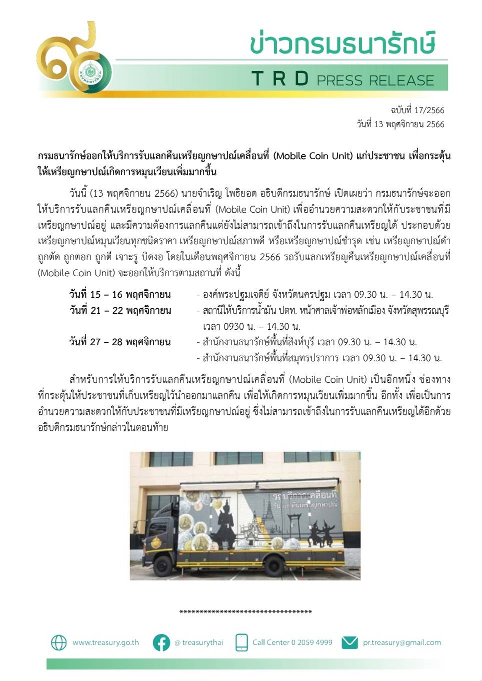 วันนี้ (13 พฤศจิกายน 2566) นายจำเริญ โพธิยอด อธิบดีกรมธนารักษ์ เปิดเผยว่า กรมธนารักษ์จะออกให้บริการรับแลกคืนเหรียญกษาปณ์เคลื่อนที่ (Mobile Coin Unit) เพื่ออำนวยความสะดวกให้กับระชาชนที่มีเหรียญกษาปณ์อยู่ และมีความต้องการแลกคืนแต่ยังไม่สามารถเข้าถึงในการรับแลกคืนเหรียญได้ ประกอบด้วย เหรียญกษาปณ์หมุนเวียนทุกชนิดราคา เหรียญกษาปณ์สภาพดี หรือเหรียญกษาปณ์ชำรุด เช่น เหรียญกษาปณ์ดำ ถูกตัด ถูกตอก ถูกตี เจาะรู บิดงอ โดยในเดือนพฤศจิกายน 2566 รถรับแลกเหรียญคืนเหรียญกษาปณ์เคลื่อนที่ (Mobile Coin Unit) จะออกให้บริการตามสถานที่ ดังนี้