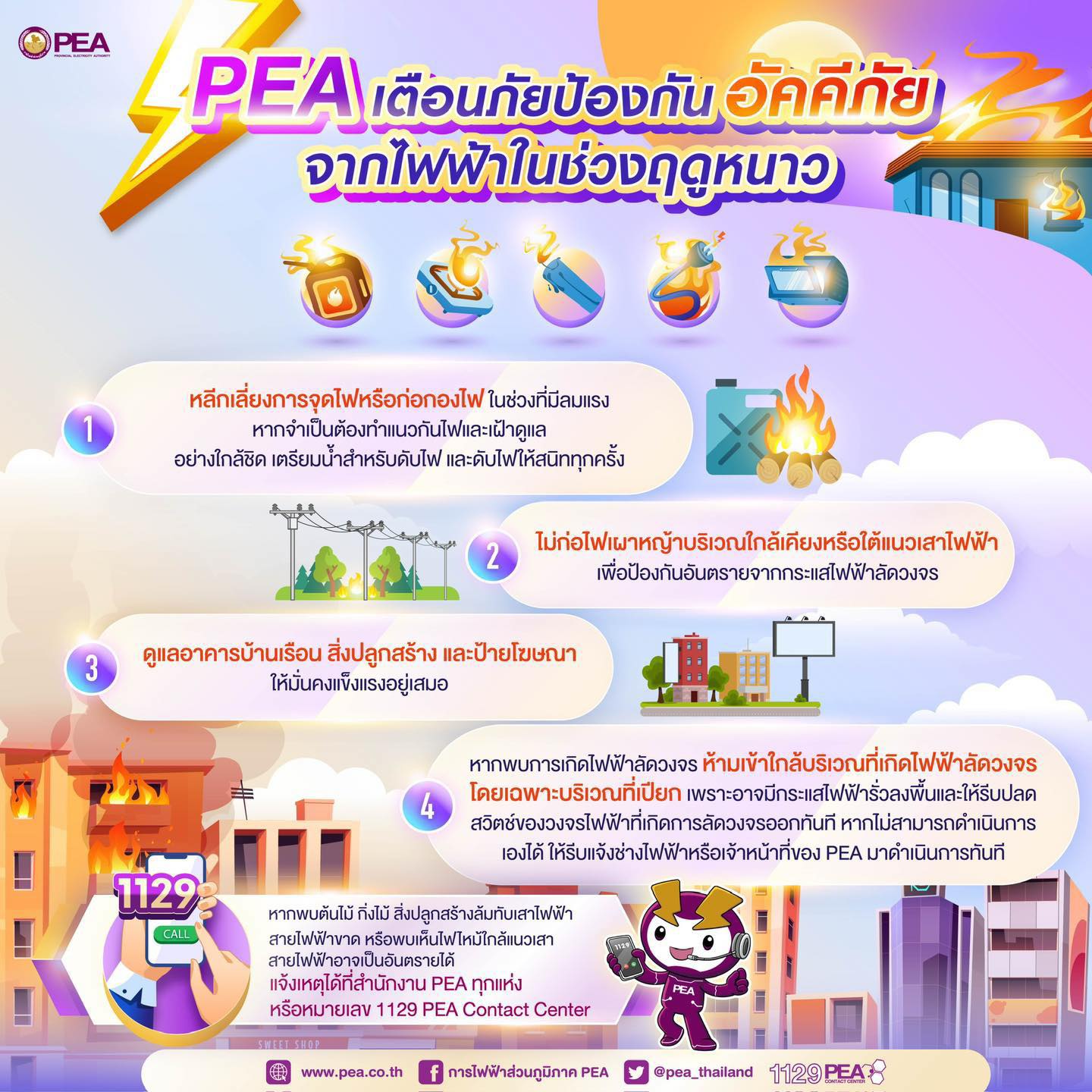 การไฟฟ้าส่วนภูมิภาค (PEA) เตือนภัยในช่วงฤดูหนาวซึ่งมีสภาพอากาศแห้งแล้ง ประกอบกับมีลมกระโชกแรง สภาพดังกล่าวอาจก่อให้เกิดไฟป่า ไฟไหม้หรือมีลมพัดแรงต้นไม้ล้มทับเสา – สายไฟ สิ่งปลูกสร้าง สร้างความเสียหายแก่ทรัพย์สินและอาจเป็นอันตรายถึงแก่ชีวิตได้ ดังนั้นเพื่อความปลอดภัยของประชาชนทุกพื้นที่ทั่วประเทศ