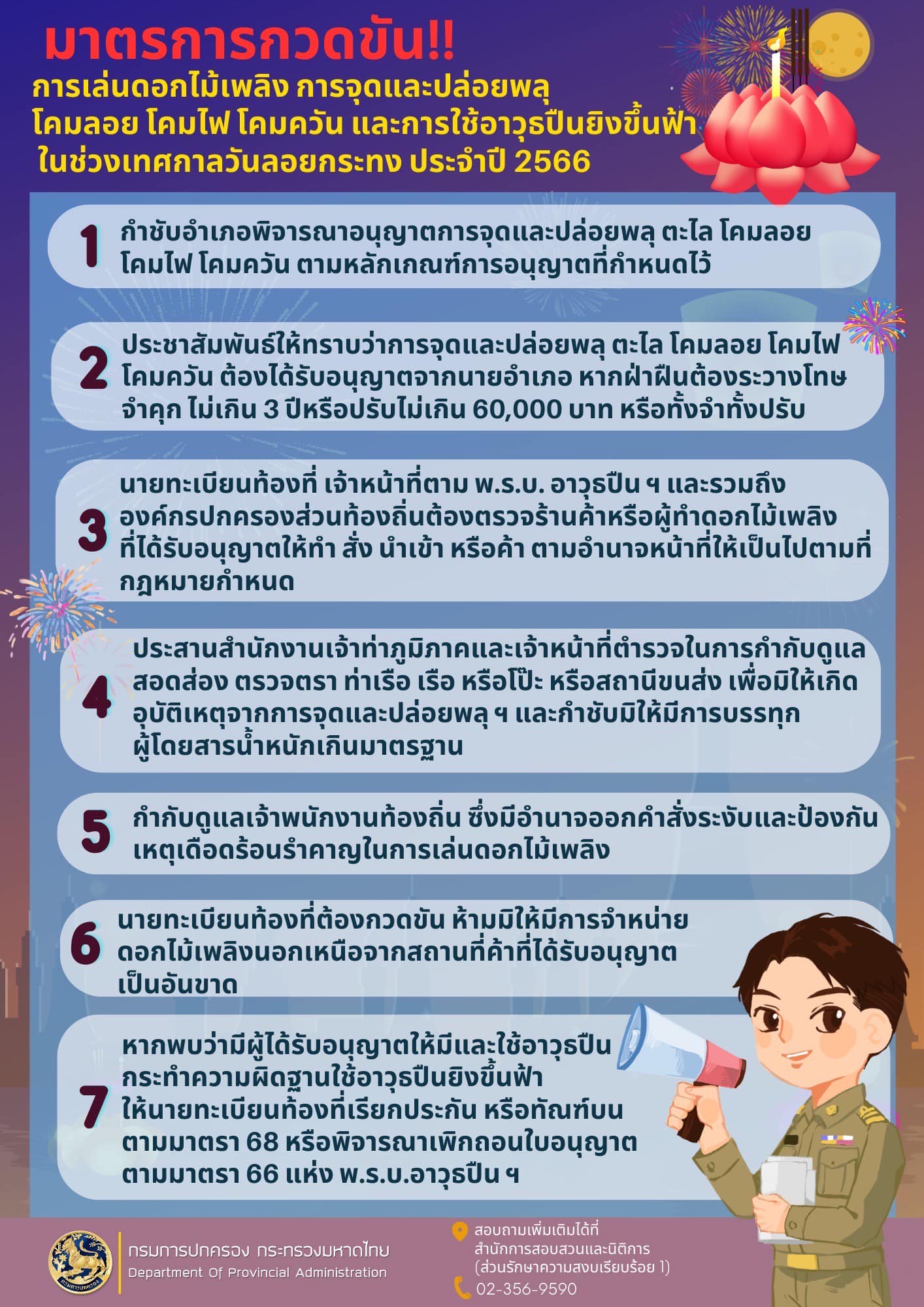กระทรวงมหาดไทย ออกมาตรการกวดขันการเล่นดอกไม้เพลิง การจุดและปล่อยพลุ โคมลอย โคมไฟ โคมควัน และการใ้ช้อาวุธปืนยิงฟ้า ในช่วงเทศกาลลอยกระทง ประจำปี 2566 ดังนี้