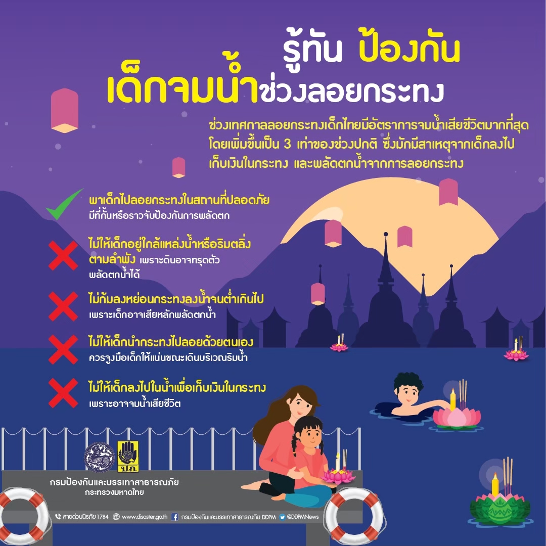 (21 พ.ย. 66) กรมป้องกันและบรรเทาสาธารณภัย (ปภ.) แนะประชาชนท่องเที่ยววันลอยกระทงอย่างปลอดภัย เลือกลอยกระทงบริเวณท่าน้ำหรือโป๊ะที่มั่นคงแข็งแรงปลอดภัย หลีกเลี่ยงตลิ่งน้ำที่สูงชันเกินไป ไม่เบียดแย่งกันขึ้นโป๊ะหรือเรือกันเป็นจำนวนมาก หากนั่งเรือควรสวมใส่ชูชีพและรอให้เรือจอดสนิททั้งก่อน-ลงเรือทุกครั้ง รวมถึงผู้ปกครองต้องเอาใจใส่บุตรหลานเป็นพิเศษ ไม่ปล่อยให้เด็กลอยกระทงโดยลำพัง เพราะเสี่ยงต่อการพลัดตกน้ำได้
