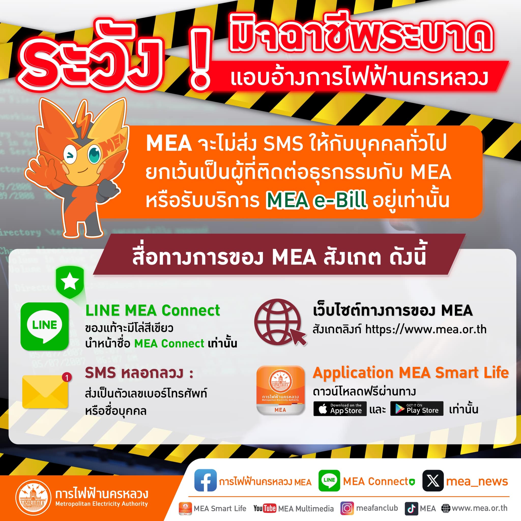 พร้อมย้ำ การไฟฟ้านครหลวง จะไม่ส่ง SMS ให้กับบุคคลทั่วไป ยกเว้นเป็นผู้ที่กำลังติดต่อธุรกรรมกับ MEA หรือรับบริการ MEA e-Bill อยู่เท่านั้น