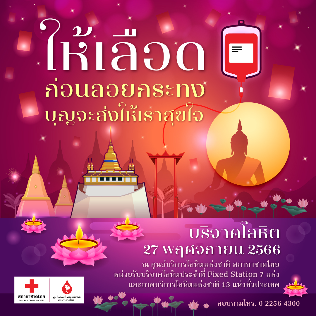ศูนย์บริการโลหิตแห่งชาติ สภากาชาดไทย ขอเชิญให้เลือด ก่อนลอยกระทง บุญจะส่งให้เราสุขใจ วันที่ 27 พฤศจิกายน 2566
