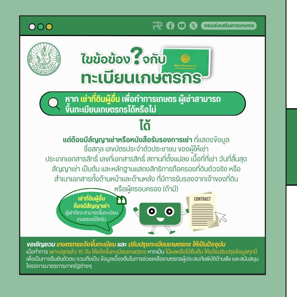 กรมส่งเสริมการเกษตร ไขข้อสงสัย ทะเบียนเกษตรกร ข่าวสารกิจกรรม กรมส่งเสริมการเกษตร ไขข้อสงสัย ทะเบียนเกษตรกร กรมส่งเสริมการเกษตร ไขข้อสงสัย ทะเบียนเกษตรกรคำถาม : หากเช่าที่ดินผู้อื่น เพื่อทำการเกษตร ผู้เช่าสามารถขึ้นทะเบียนเกษตรกรได้หรือไม่คำตอบ : ได้ แต่ต้องมีสัญญาเช่าหรือหนังสือรับรองการเช่า ที่แสดงข้อมูล ชื่อสกุล เลขบัตรประจำตัวประชาชน ของผู้ให้เช่า ประเภทเอกสารสิทธิ์ เลขที่เอกสารสิทธิ์ สถานที่ตั้งแปลง เนื้อที่ที่เช่า วันที่สิ้นสุดสัญญาเช่า เป็นตัน และหลักฐานแสดงสิทธิการถือครองที่ดินตัวจริง หรือสำเนาเอกสารทั้งด้านหน้าและด้านหลัง ที่มีการรับรองจากเจ้าของที่ดินหรือผู้ครอบครอง ที่มา : https://shorturl.asia/osM2g Post Views: 18 FacebookFacebookXTwitterLINELine