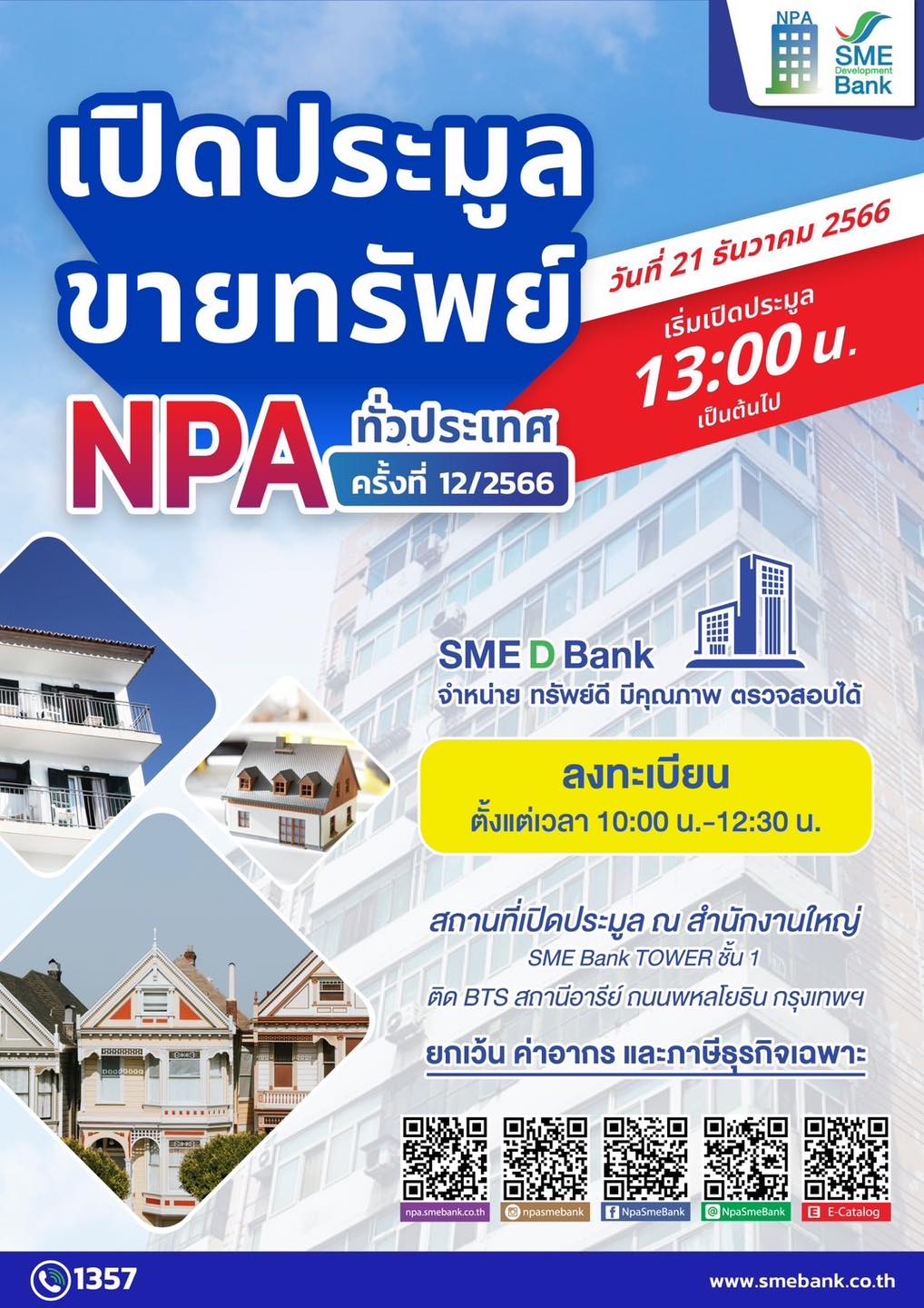 กระทรวงการคลัง ขอเชิญร่วมงานประมูลขายทรัพย์ NPA ครั้งที่ 12/2566 วันพฤหัสบดีที่ 21 ธันวาคม 2566 ณ SME Bank สำนักงานใหญ่