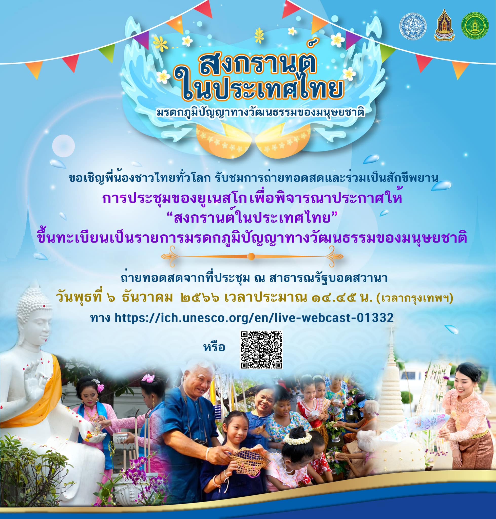 กรมส่งเสริมวัฒนธรรม ขอเชิญพี่น้องชาวไทยทั่วโลก รับชมการถ่ายทอดสด และร่วมเป็นสักขีพยาน การประชุมของยูเนสโก เพื่อพิจารณาประกาศให้ “สงกรานต์ในประเทศไทย ประเพณีปีใหม่ไทย” (Songkran in Thailand, traditional Thai New Year festival) ขึ้นทะเบียนเป็นรายการมรดกภูมิปัญญาทางวัฒนธรรมของมนุษยชาติ