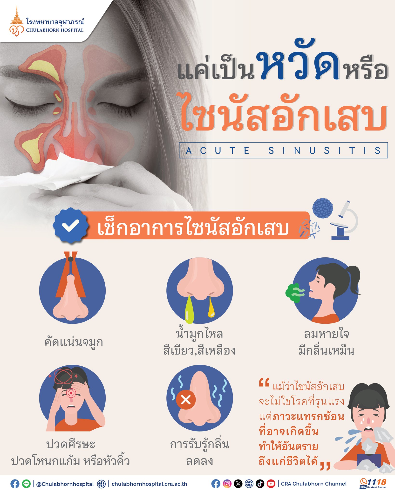 ช่วงนี้อากาศเปลี่ยนแปลง หลาย ๆ คนอาจมีอาการหวัดซึ่งเกิดจากการติดเชื้อไวรัสทางเดินหายใจ ซึ่งปกติแล้วอาการจะดีขึ้นภายใน 5-7 วัน แต่หากผู้ป่วยมีอาการนานกว่า 10 วันขึ้นไป โดยที่อาการไม่ดีขึ้น หรืออาการดีขึ้นในช่วงแรกแล้วกลับแย่ลงอีก ถือเป็นลักษณะของโรคไซนัสอักเสบเฉียบพลันที่อาจเกิดจากการติดเชื้อแบคทีเรีย