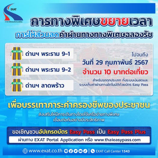 ทั้งนี้ ขอเชิญชวนผู้ใช้บริการบัตร Easy Pass ลงทะเบียนปรับปรุงข้อมูลด้วยตนเองทาง EXAT Portal Application หรือ www.thaieasypass.com เพื่อยกระดับบัตร Easy Pass เป็น Easy Pass Plus เตรียมพร้อมเข้าสู่ระบบเก็บค่าผ่านทางอัตโนมัติแบบไม่มีไม้กั้น (M-Flow) อีกด้วย
