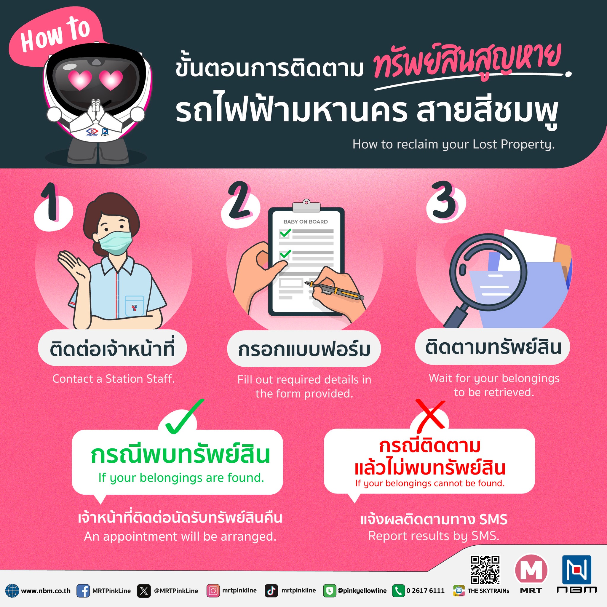- เมื่อลืมของ หรือของหาย อย่าเพิ่งกังวลไปครับ แอดมิน มี How to ขั้นตอนการติดตามทรัพย์สินสูญหาย ภายในสถานี หรือภายในขบวนรถไฟฟ้ามหานคร สายสีชมพู ดังนี้