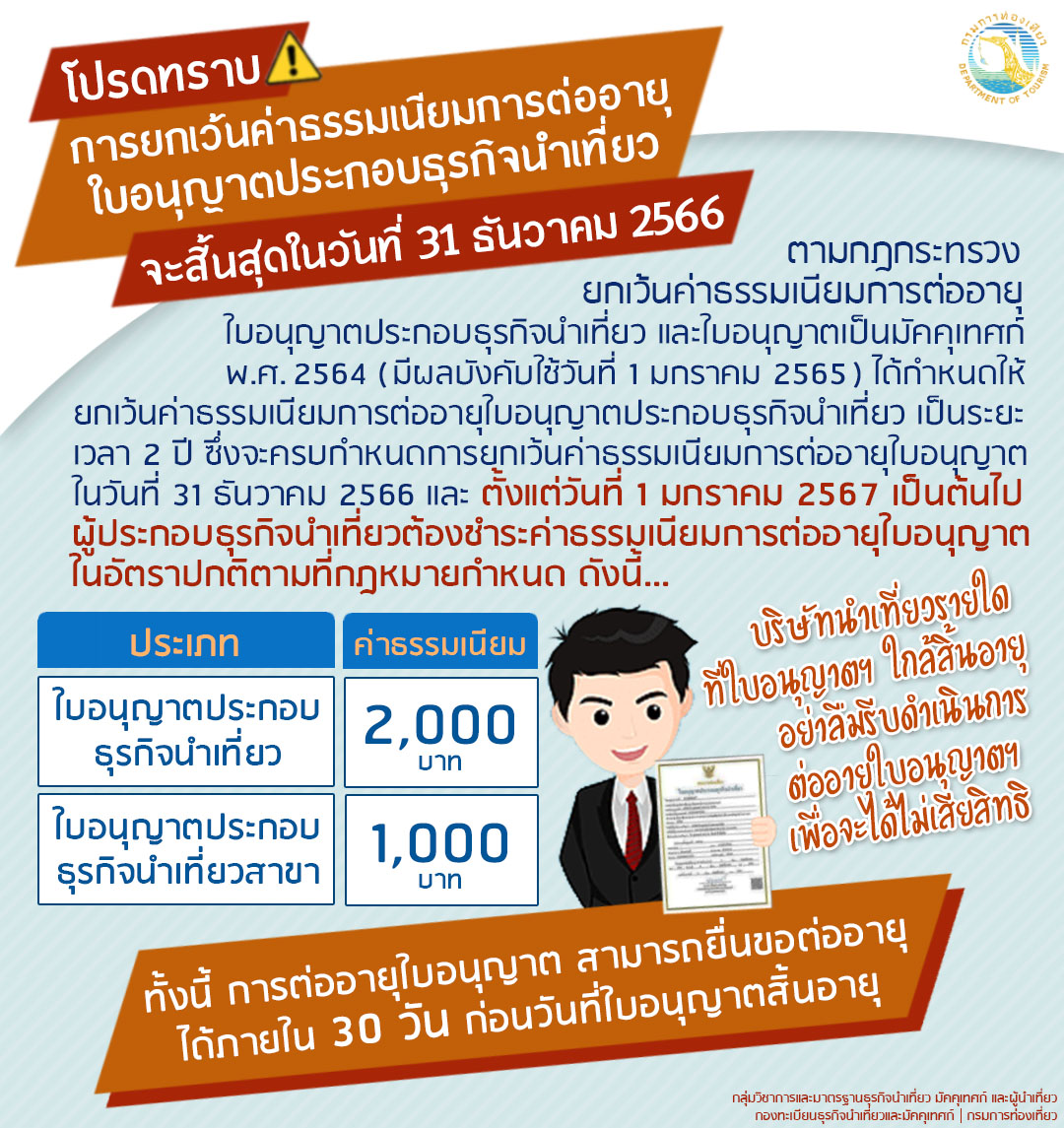 กรมการท่องเที่ยว แจ้งการยกเว้นค่าธรรมเนียมการต่ออายุ ใบอนุญาตประกอบธุรกิจนำเที่ยว จะสิ้นสุดในวันที่ 31 ธันวาคม 2566