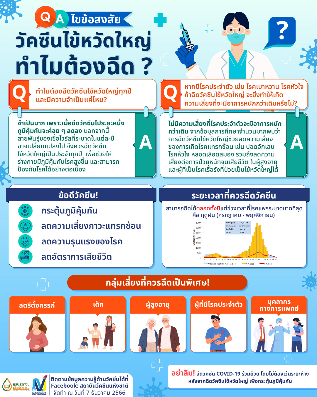 ในปี 2566 ไข้หวัดใหญ่กลับมาระบาดหนัก โดยพบผู้ป่วยมากขึ้นถึง 6 เท่าเมื่อเทียบกับปีที่ผ่านมา ข้อมูลจากกรมควบคุมโรค ปี 2566 พบผู้ป่วย 404,896 ราย พบว่ามีผู้ติดเชื้อประมาณ 12,000 รายต่อสัปดาห์ และปีนี้มีผู้เสียชีวิตแล้ว 26 ราย ทั้งนี้ ไข้หวัดใหญ่เป็นโรคติดต่อในระบบทางเดินหายใจ โดยผู้ติดเชื้อจะได้รับเชื้อที่ปนเปื้อนอยู่ในอากาศ จากการไอ จาม หรือพูดจากผู้ป่วยที่มีอาการดังกล่าว หรือจากการสัมผัสกับพื้นผิวที่มีเชื้อไวรัสไข้หวัดใหญ่ เราสามารถป้องกันได้ด้วยการสวมหน้ากากอนามัย ล้างมือบ่อย ๆ และหลีกเลี่ยงสถานที่แออัด นอกจากนี้วิธีป้องกันที่ได้ผลดี และช่วยลดความรุนแรงของอาการเจ็บป่วยได้ คือ “การฉีดวัคซีน”