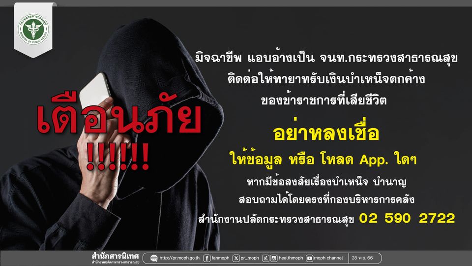 กระทรวงสาธารณสุข เตือนภัยมิจฉาชีพ แอบอ้างเป็น เจ้าหน้าที่กระทรวงสาธารณสุขติดต่อให้ทายาทรับเงินบำเหน็จตกค้างของข้าราชการที่เสียชีวิต เตือนประชาชนอย่าหลงเชื่อให้ข้อมูลหรือโหลด App ใดๆ