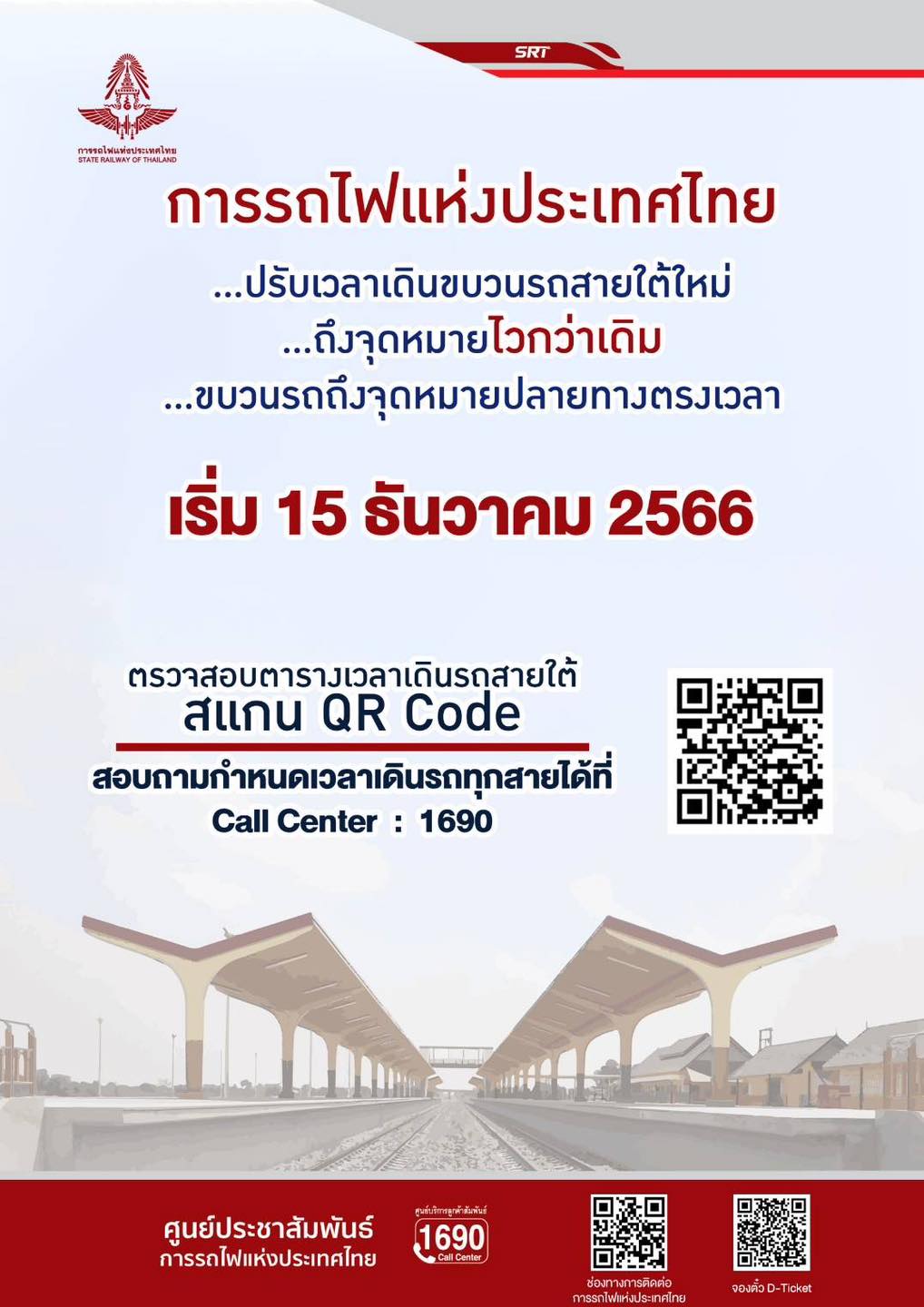 การรถไฟแห่งประเทศไทย ขานรับนโยบาย Quick Win “คมนาคม ของประชาชน” เร่งเปิดใช้ทางคู่สายใต้ พร้อมปรับเวลาเดินรถใหม่ ถึงจุดหมายเร็วขึ้น เริ่มวันที่ 15 ธันวาคม 2566 นี้