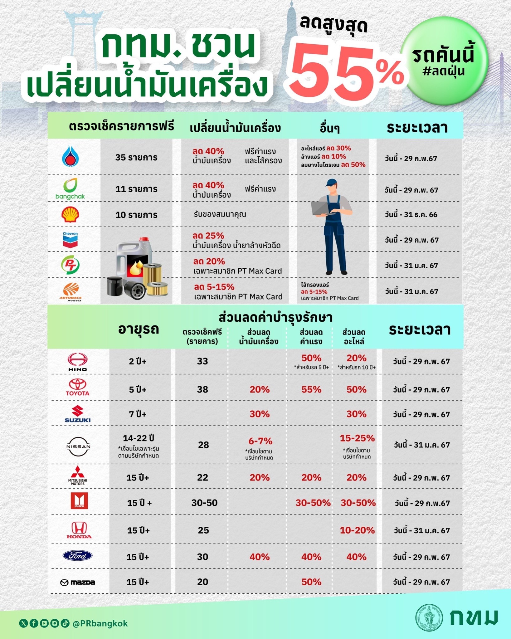 กรุงเทพมหานคร ร่วมกับค่ายรถยนต์และผู้ค้าน้ำมัน จัดโปรโมชั่นลดค่าบริการการตรวจสอบสภาพรถ