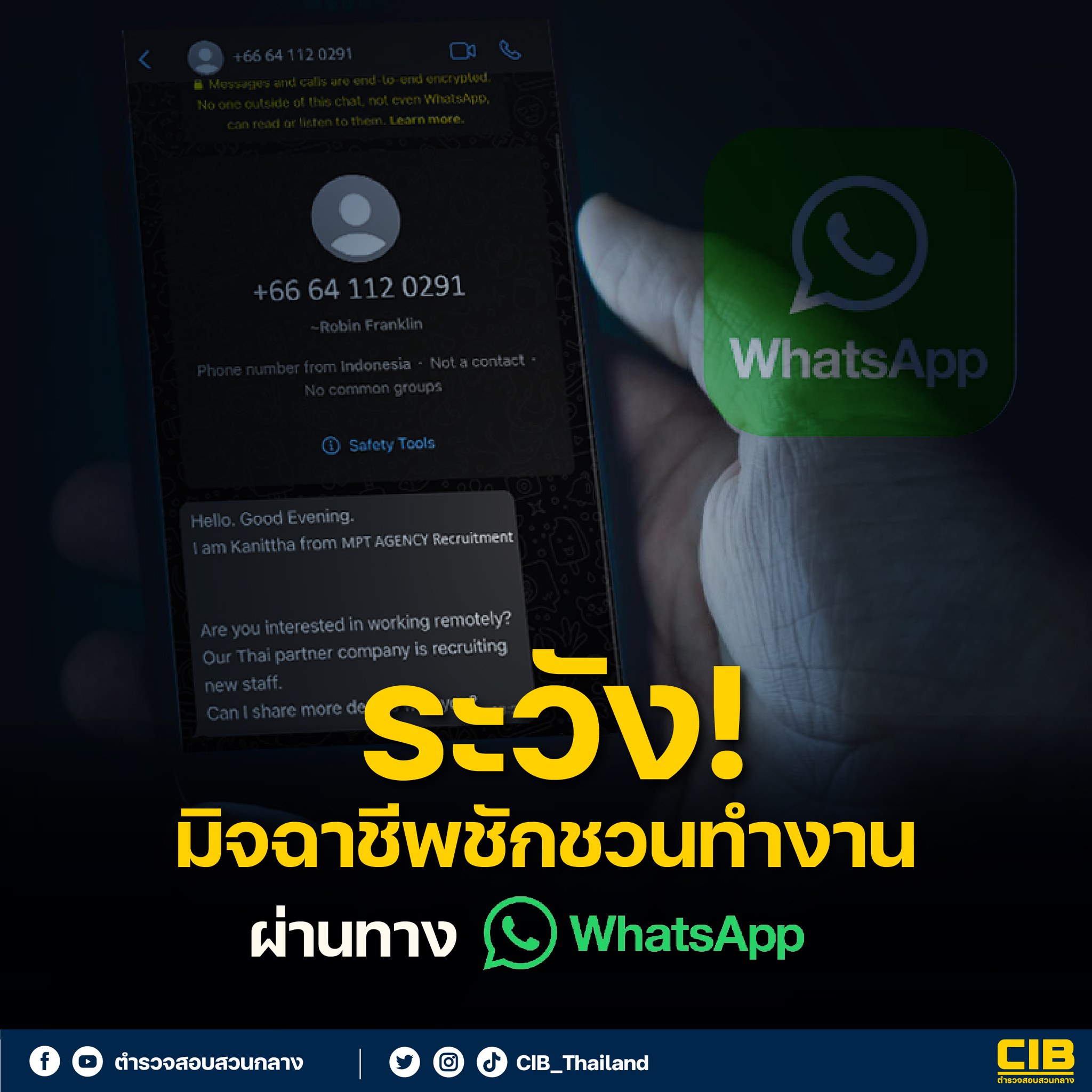 ตำรวจสอบสวนกลาง เตือนระวัง มิจฉาชีพ ลวงทำงานผ่าน WhatsApp