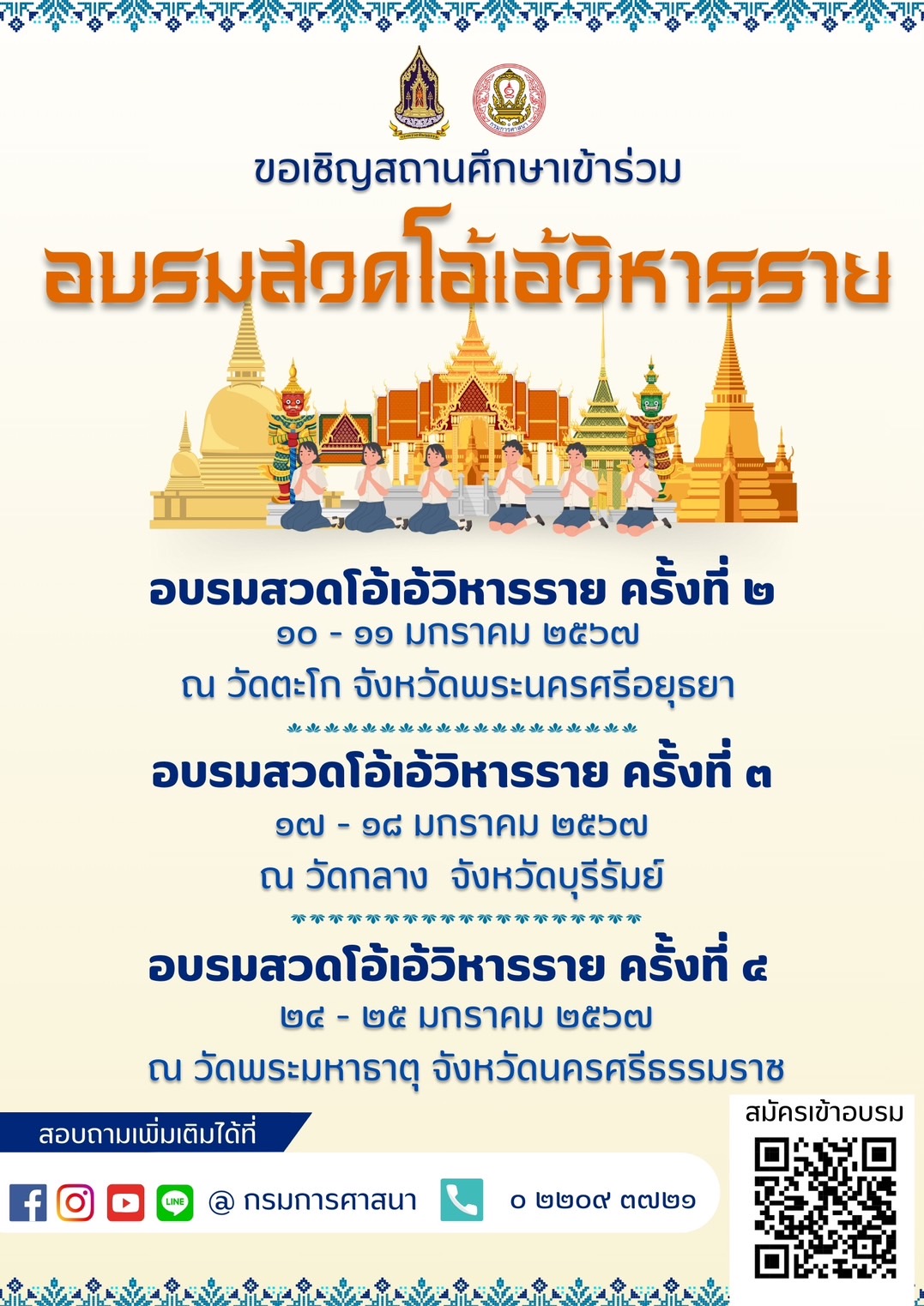 กรมการศาสนา ขอเชิญเข้าร่วมอบรมสวดโอ้เอ้วิหารราย (ส่วนภูมิภาค) ประจำปีงบประมาณ 2567