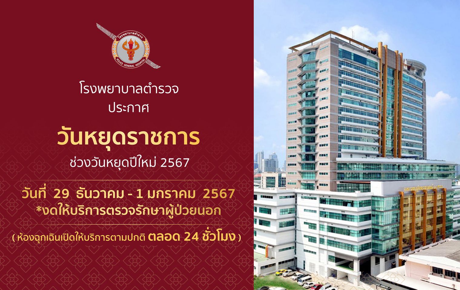 โรงพยาบาลตำรวจ แจ้งวันหยุดราชการ ช่วงวันหยุดปีใหม่ 2567 วันที่ 29 ธันวาคม 2566 – 1 มกราคม 2567 โดยงดบริการผู้ป่วยนอก (เปิดบริการที่ห้องฉุกเฉิน ตึกเฉลิมพระเกียรติ ตลอด 24 ชั่วโมง)