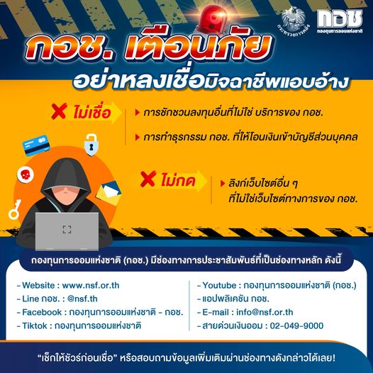 กองทุนการออมแห่งชาติ แจ้งเตือนสมาชิก และประชาชนทั่วไป โปรดใช้ความระมัดระวัง หากพบมิจฉาชีพแอบอ้างเป็น กอช. หรือ ชักชวนให้ลงทุนอื่นที่ไม่ใช่บริการ กอช.