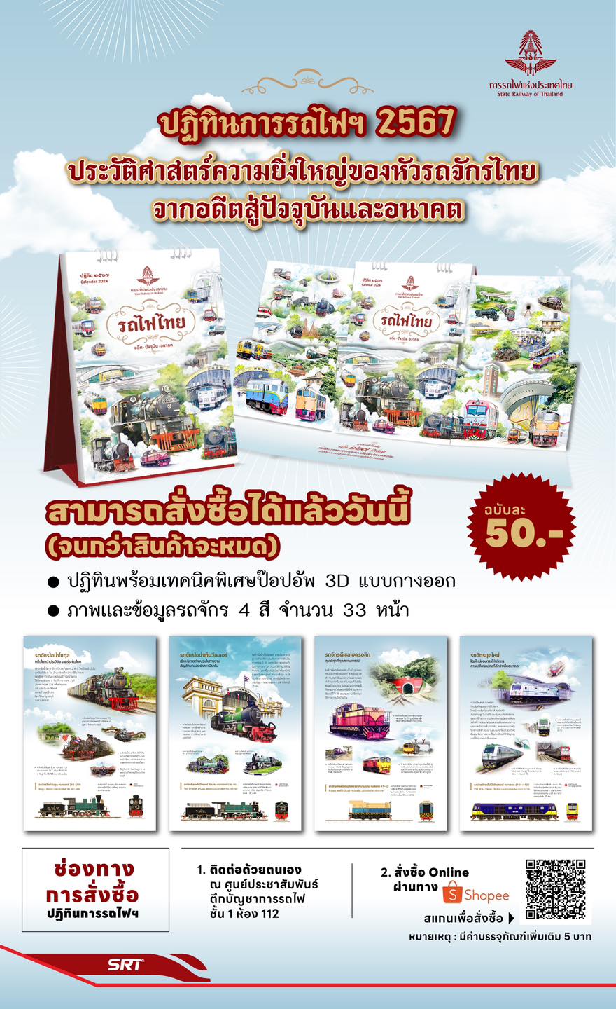 การรถไฟแห่งประเทศไทย เปิดจำหน่ายปฏิทินการรถไฟฯ ประจำปี 2567 เรียนรู้ประวัติศาสตร์ความยิ่งใหญ่ของหัวรถจักรไทย จากอดีตสู่ปัจจุบัน และอนาคต ทั้งนี้ ปฏิทินการรถไฟฯ 2567 มาพร้อมเทคนิคพิเศษป๊อปอัพ 3D แบบกางออก 3 ตอน เผยความยิ่งใหญ่ของหัวรถจักรไทย มีภาพ 4 สี พร้อมข้อมูลรถจักร มากถึง 33 หน้า