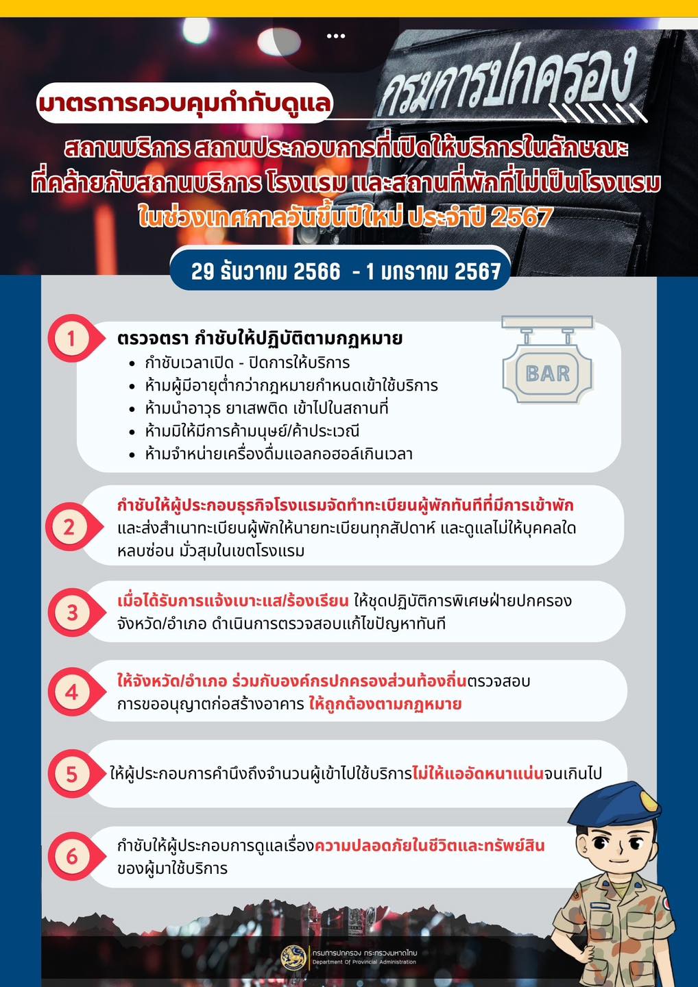 กรมการปกครอง ออกมาตรการควบคุมกำกับดูแลสถานบริการ สถานประกอบการที่เปิดให้บริการในลักษณะที่คล้ายกับสถานบริการ โรงแรม และสถานที่พักที่ไม่เป็นโรงแรม ในช่วงเทศกาลวันขึ้นปีใหม่ ประจำปี 2567 วันที่ 29 ธันวาคม 2566 – 1 มกราคม 2567 นี้