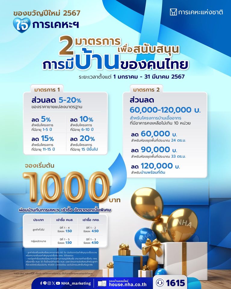 การเคหะแห่งชาติ มอบของขวัญปีใหม่ 2567 เริ่มวันที่ 1 มกราคม – 31 มีนาคม 2567 ผ่าน 2 มาตรการเพื่อสนับสนุนการมีบ้านของคนไทย ดังนี้