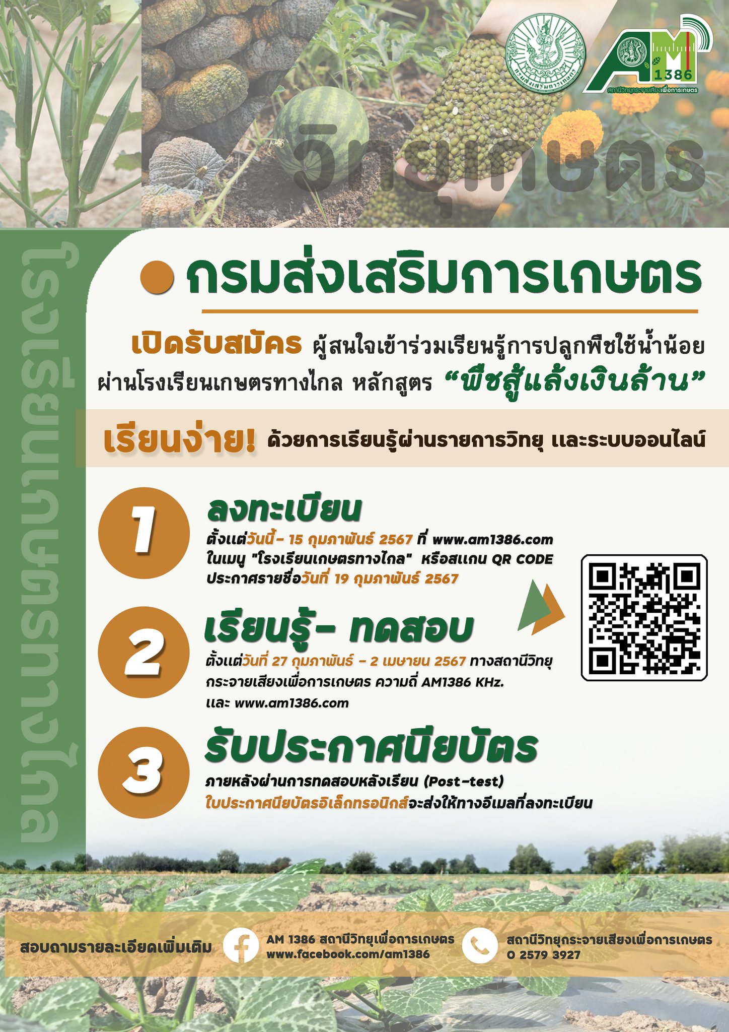 กรมส่งเสริมการเกษตร เปิดรับสมัครผู้สนใจ เข้าร่วมเรียนรู้การปลูกพืชใช้น้ำน้อย ผ่านโรงเรียนเกษตรทางไกล หลักสูตร “พืชสู้แล้งเงินล้าน” ลงทะเบียนได้ตั้งแต่วันนี้ – 15 กุมภาพันธ์ 2567 ที่ www.am1386.com ในเมนู “โรงเรียนเกษตรทางไกล หรือสแกน QR Code หรือคลิก https://forms.gle/pU8j63zt6nAG6kV56