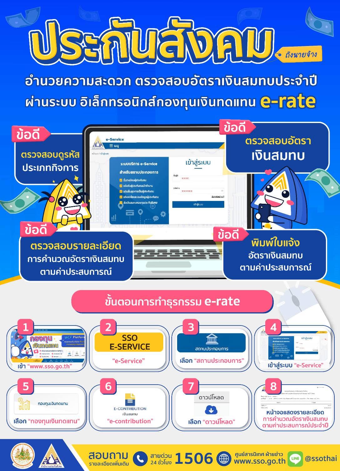 นายบุญสงค์ ทัพชัยยุทธ์ เลขาธิการสำนักงานประกันสังคม กระทรวงแรงงาน เปิดเผยว่า สำนักงานประกันสังคม โดยกองทุนเงินทดแทน ได้มีการพัฒนาระบบแจ้งอัตราเงินสมทบประจำปี ผ่านระบบอิเล็กทรอนิกส์กองทุนเงินทดแทน (e-rate) เพื่อเป็นการอำนวยความสะดวกให้กับนายจ้างในการรับข่าวสารต่าง ๆ และสามารถใช้งาน e-rate ผ่านทางระบบ e-service ที่เว็บไซต์ www.sso.go.th โดยนายจ้างสามารถตรวจสอบอัตราเงินสมทบกองทุนเงินทดแทน เรียกดูรายละเอียดการคำนวณอัตราเงินสมทบตามค่าประสบการณ์ประจำปี รวมทั้งพิมพ์ใบแจ้งอัตราเงินสมทบประจำปีได้ด้วยตนเอง