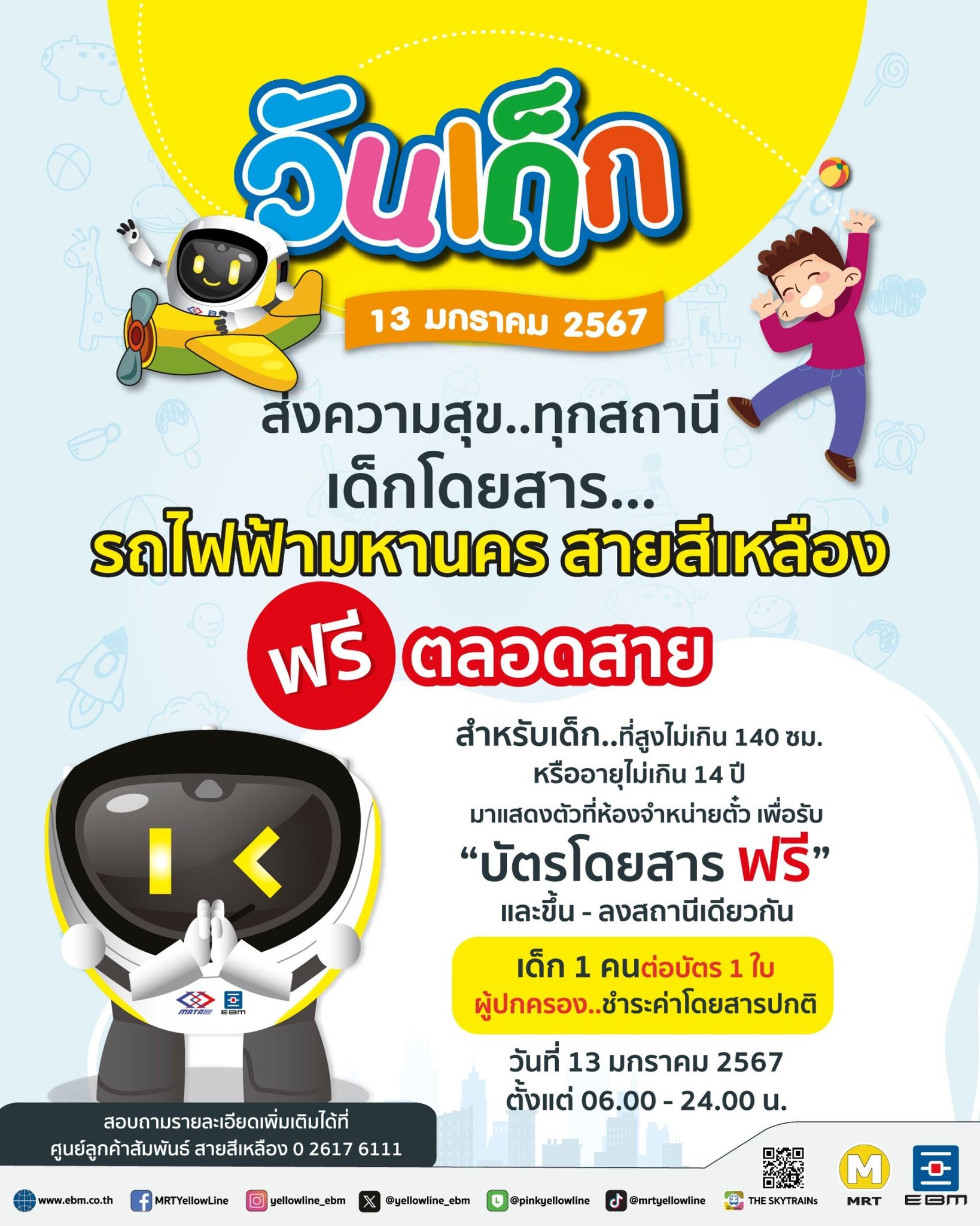 รถไฟฟ้ามหานคร สายสีเหลือง ส่งความสุขทุกสถานี เด็กๆ อายุไม่เกิน 14 ปี นั่งรถไฟฟ้าสายสีเหลืองฟรี
