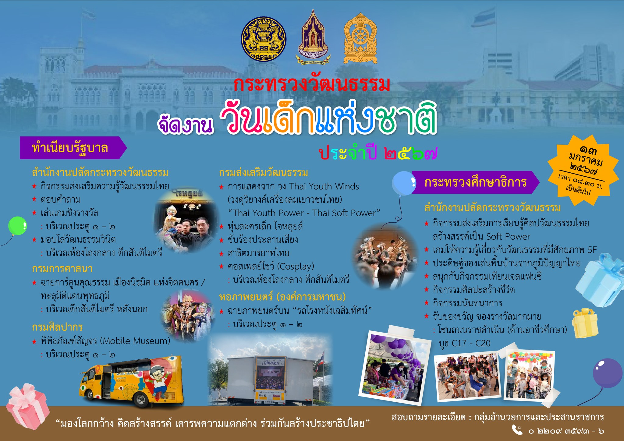 กระทรวงวัฒนธรรม จัดงาน “วันเด็กแห่งชาติ” ณ ทำเนียบรัฐบาล และกระทรวงศึกษาธิการ “ มองโลกกว้าง คิดสร้างสรรค์ เคารพความแตกต่าง ร่วมกันสร้างประชาธิปไตย”
