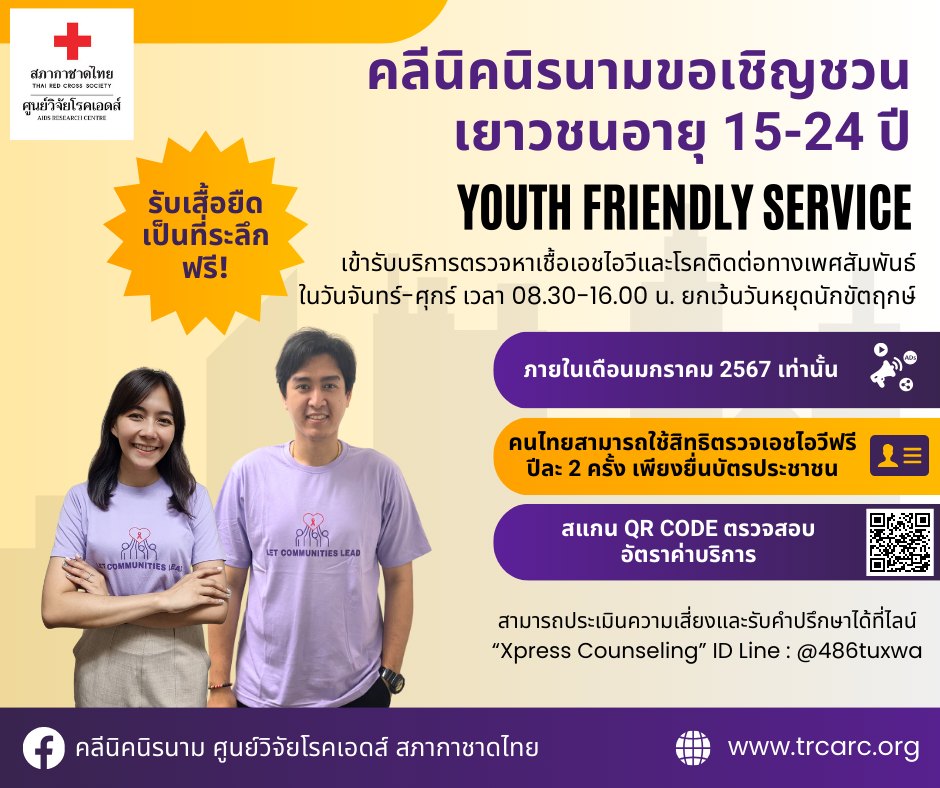 ศูนย์วิจัยโรคเอดส์ สภากาชาดไทย เชิญชวนเยาวชนอายุระหว่าง 15-24 ปี เข้ารับบริการตรวจคัดกรองเชื้อเอชไอวีและโรคติดต่อทางเพศสัมพันธ์ ที่คลีนิคนิรนาม ถนนราชดำริ เขตปทุมวัน กรุงเทพฯ ในโครงการ “YOUTH FRIENDLY SERVICE” พิเศษรับเสื้อยืด “LET COMMUNITIES LEAD” เป็นที่ระลึก สามารถ walk in ได้เฉพาะวันจันทร์-ศุกร์ เวลา 08.30-16.00 น. (ยกเว้นวันหยุดนักขัตฤกษ์) ภายในเดือนมกราคม 2567 เท่านั้น