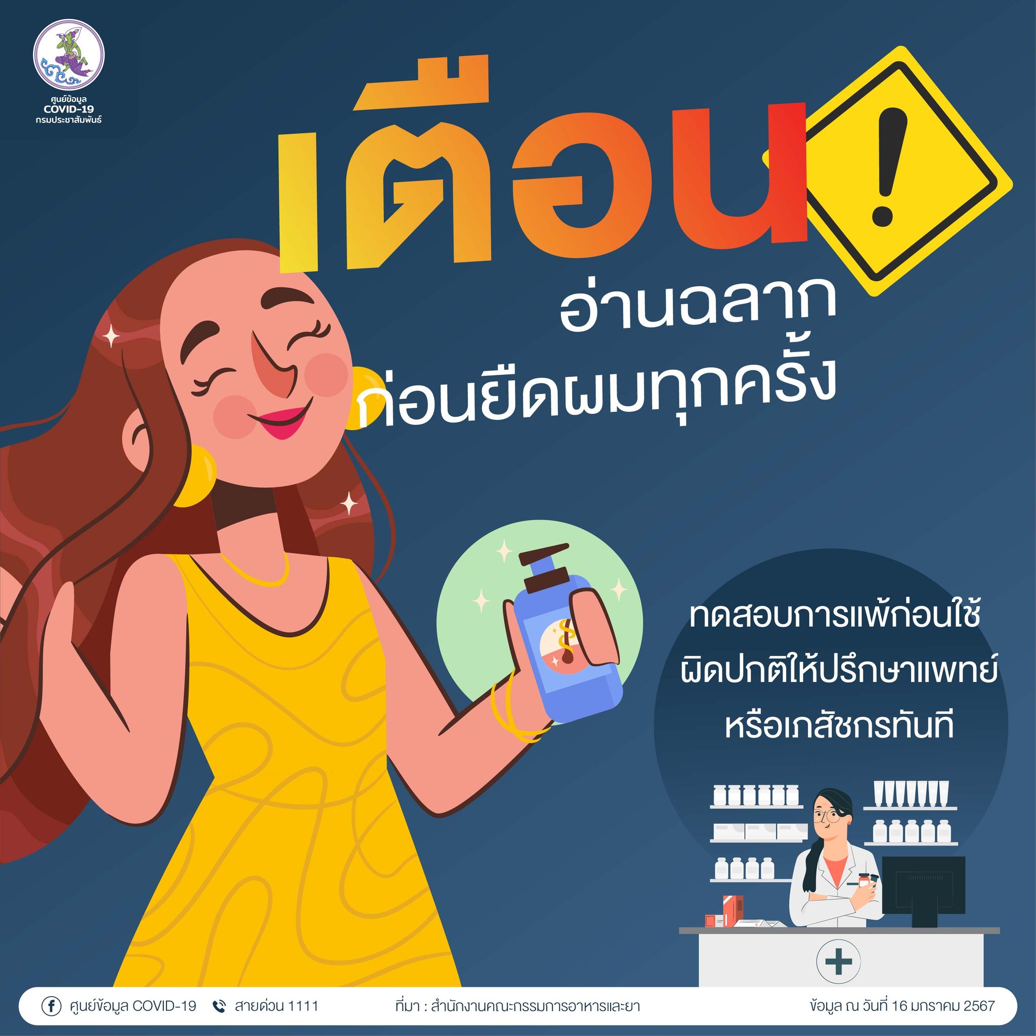 สำนักงานคณะกรรมการอาหารและยา เตือนอ่านฉลากก่อนยืดผมทุกครั้ง ทดสอบการแพ้ก่อนใช้ ผิดปกติให้ปรึกษาแพทย์หรือเภสัชกรทันที