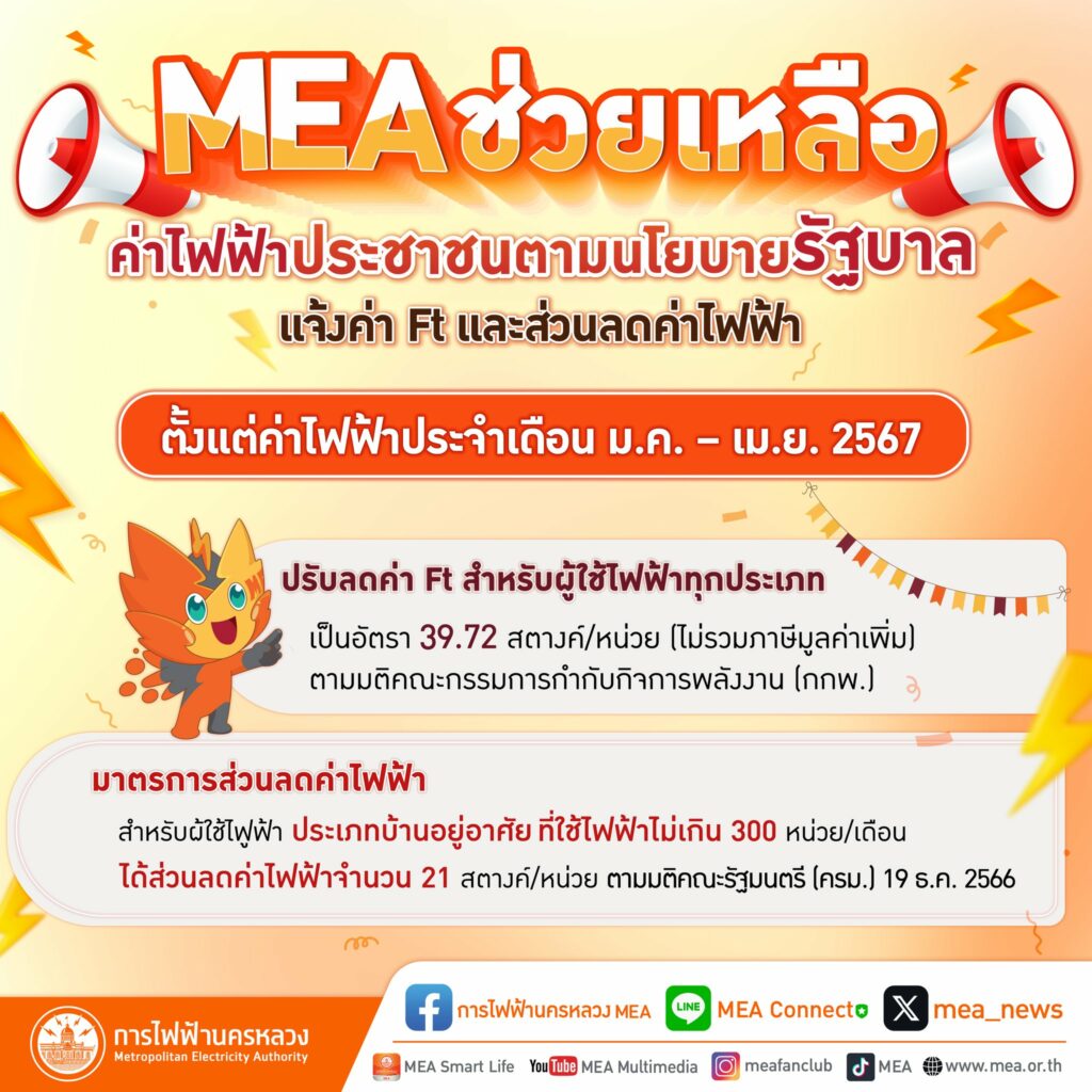 การไฟฟ้านครหลวง แจ้งค่า Ft และส่วนลดค่าไฟฟ้า ตั้งแต่ค่าไฟฟ้าประจำเดือน มกราคม – เมษายน 2567 เพื่อช่วยเหลือค่าไฟฟ้าประชาชนตามนโยบายรัฐบาล