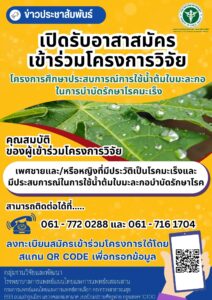 กรมการแพทย์แผนไทยและการแพทย์ทางเลือก จะเริ่มการศึกษาวิจัยจากประสบการณ์การใช้น้ำต้มใบมะละกอสดในการบำบัดรักษาโรคมะเร็ง จากผู้ป่วยจริงที่ใช้อยู่ จึงขอประชาสัมพันธ์ให้ผู้ป่วยมะเร็งที่ดูแลรักษาตนเองด้วยน้ำต้มใบมะละกอจนมีสุขภาพดีขึ้นแล้ว หรือมีปัญหาทางสุขภาพจากการดื่มน้ำต้มใบมะละกอเพื่อรักษามะเร็งของตนเอง มาให้ข้อมูลที่เป็นประโยชน์กับ ทีมงานวิจัยของกรมการแพทย์แผนไทยและการแพทย์ทางเลือก ได้ที่ โรงพยาบาลการแพทย์แผนไทยและการแพทย์ผสมผสาน กรมการแพทย์แผนไทยและการแพทย์ทางเลือก 693 ถนนบำรุงเมือง แขวงคลองมหานาค เขตป้อมปราบศัตรูพ่าย กรุงเทพมหานคร 10100 ผู้ประสานงาน นางสาวพิมพ์ลดา พงศ์ชัยชานนท์ นายชุติวัติ หยู่ทองอินทร์ โทร 06 1772 0288 และ 06 1716 1704