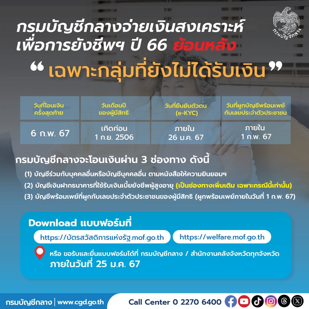 นางสาวทิวาพร ผาสุข รองอธิบดีกรมบัญชีกลาง ในฐานะโฆษกกรมบัญชีกลาง เปิดเผยว่า คณะกรรมการบริหารกองทุนผู้สูงอายุ เห็นชอบให้เพิ่มช่องทางการโอนเงินสงเคราะห์เพื่อการยังชีพแก่ผู้สูงอายุที่มีรายได้น้อยที่ได้รับสิทธิ ในโครงการลงทะเบียนเพื่อสวัสดิการแห่งรัฐ ปี 2565 ประจำปีงบประมาณ พ.ศ. 2566 เฉพาะผู้ที่มีสิทธิแต่ยังไม่ได้รับเงิน โดยกรมบัญชีกลางจะโอนเงินให้แก่ผู้มีสิทธิที่ตรงตามเงื่อนไข ดังนี้