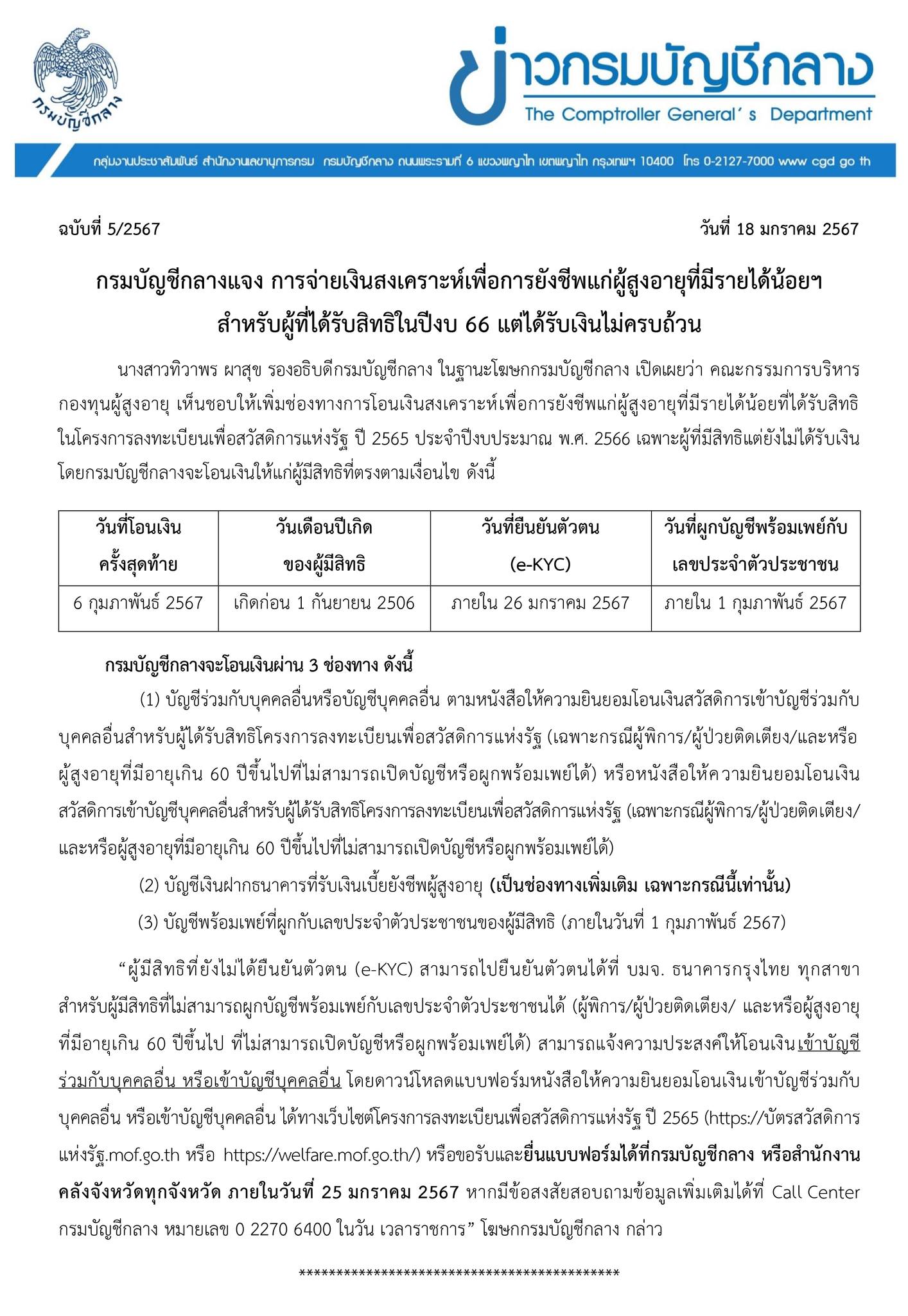 กรมบัญชีกลาง ชี้แจงการจ่ายเงินสงเคราะห์เพื่อการยังชีพแก่ผู้สูงอายุที่มีรายได้น้อยฯ งบปี 2566 แต่ได้รับเงินไม่ครบถ้วน