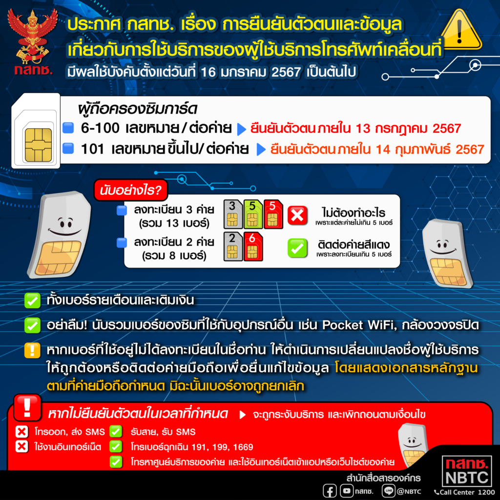 กสทช.แจ้งผู้ที่ถือครองซิมการ์ดตั้งแต่ 6 หมายเลขขึ้นไป ต้องยืนยันตัวตน เริ่มวันที่ 16 มกราคม 2567