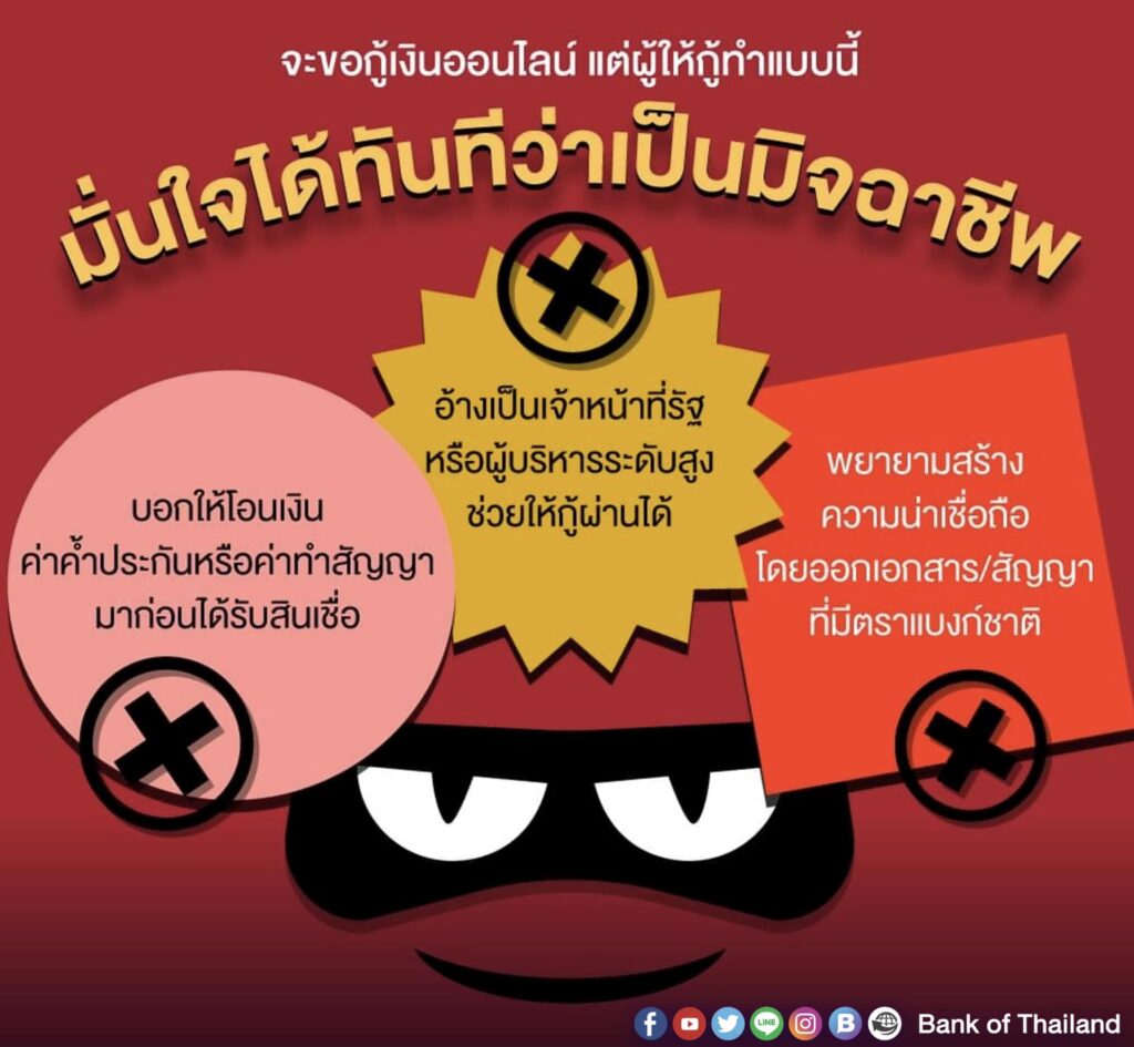 - ธนาคารแห่งประเทศไทย แจ้งเตือน 3 พฤติกรรมมิจฉาชีพ ที่แฝงกายมาเป็นผู้ให้กู้ออนไลน์