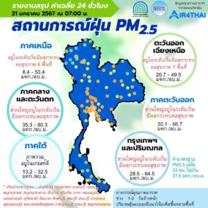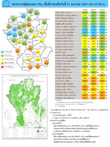 ศูนย์แก้ไขปัญหามลพิษทางอากาศ รายงานการติดตามตรวจสอบคุณภาพอากาศ ประจำวันที่ 21 มกราคม 2567 เวลา 07.00 น. สรุปดังนี้