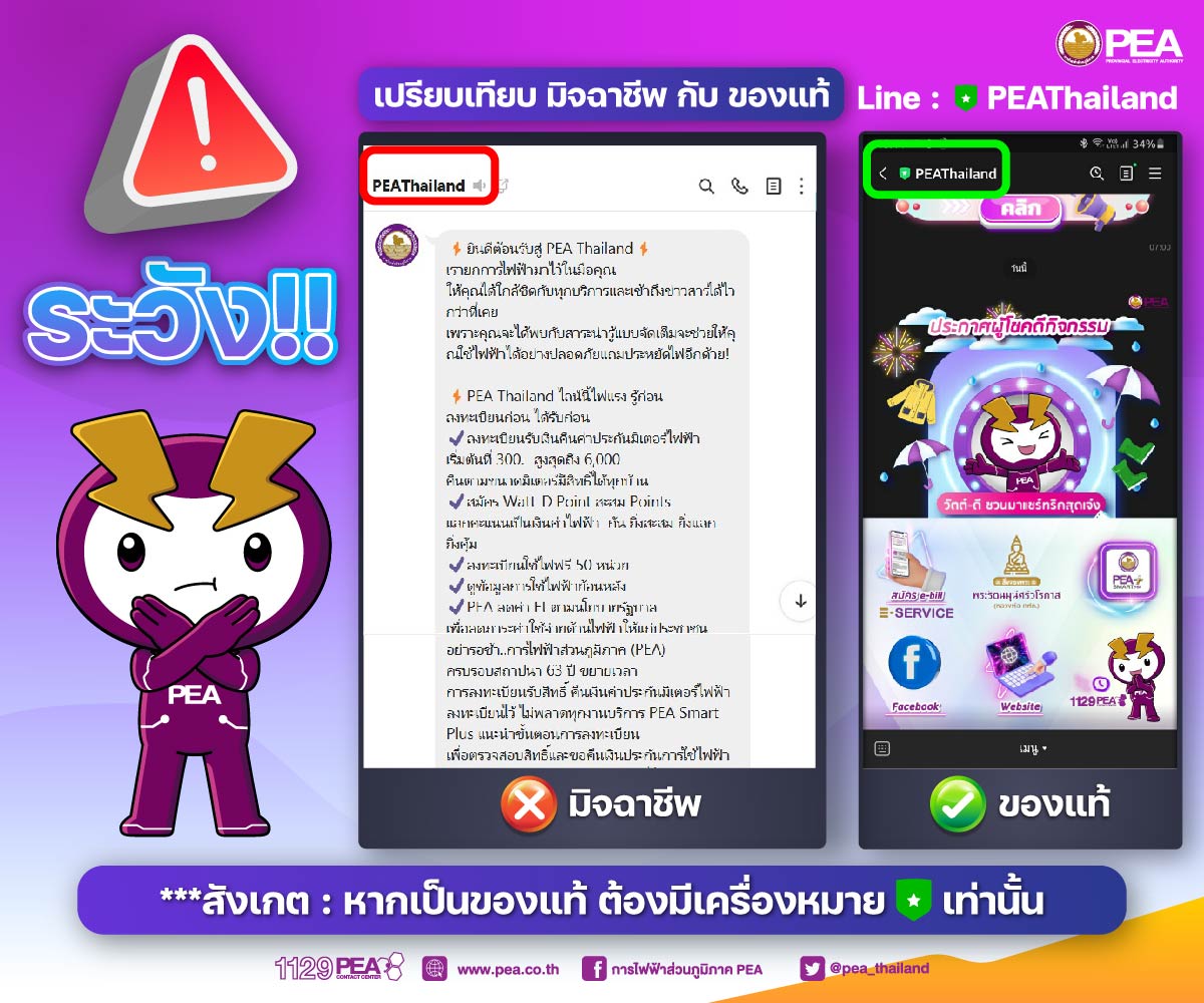 การไฟฟ้าส่วนภูมิภาค เตือนประชาชน อย่าหลงเชื่อมิจฉาชีพ ปลอมบัญชี LINE Official Account ของการไฟฟ้าส่วนภูมิภาค (PEA)