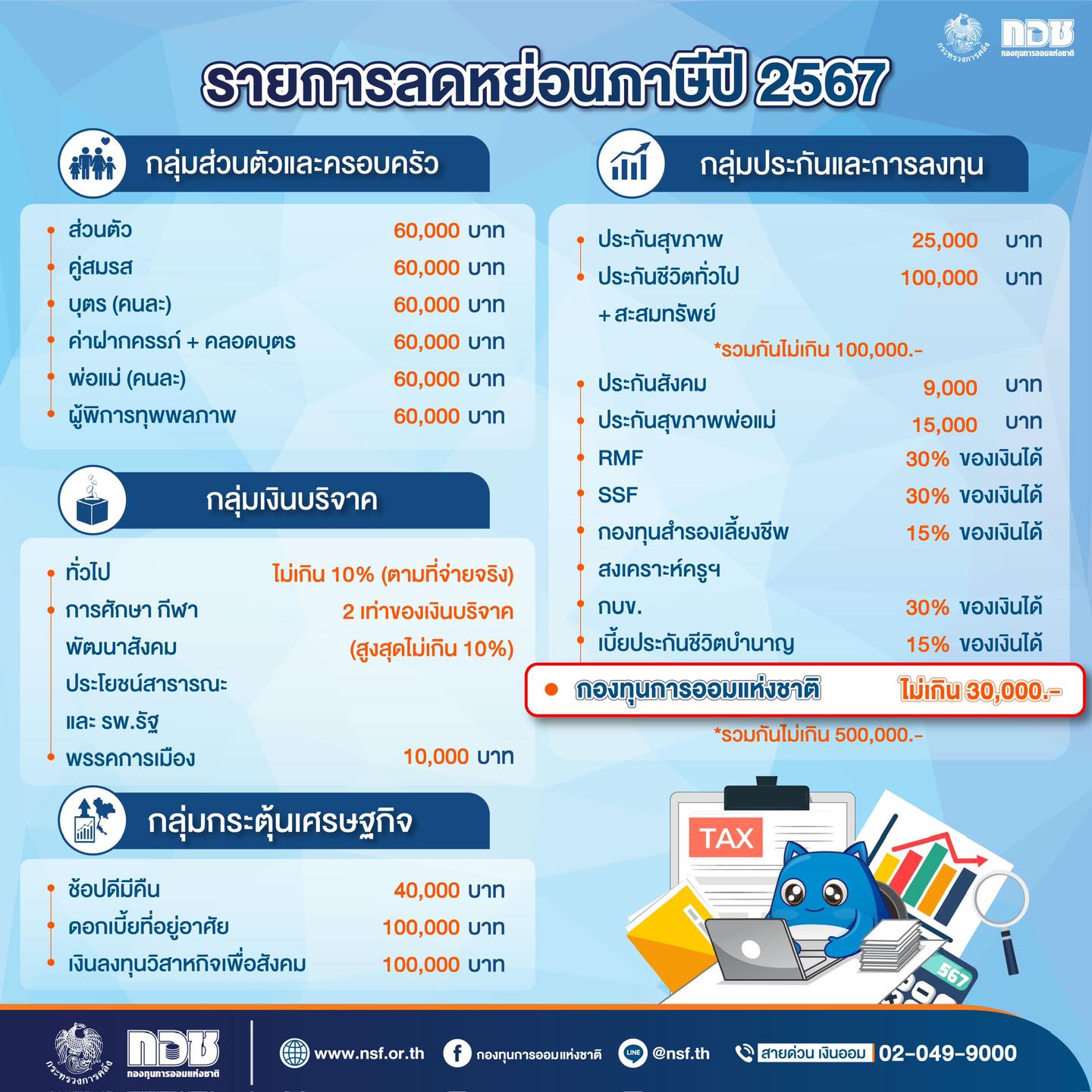 - กองทุนการออมแห่งชาติ (กอช.) ตามที่จ่ายจริง สูงสุดไม่เกิน 30,000 บาท
