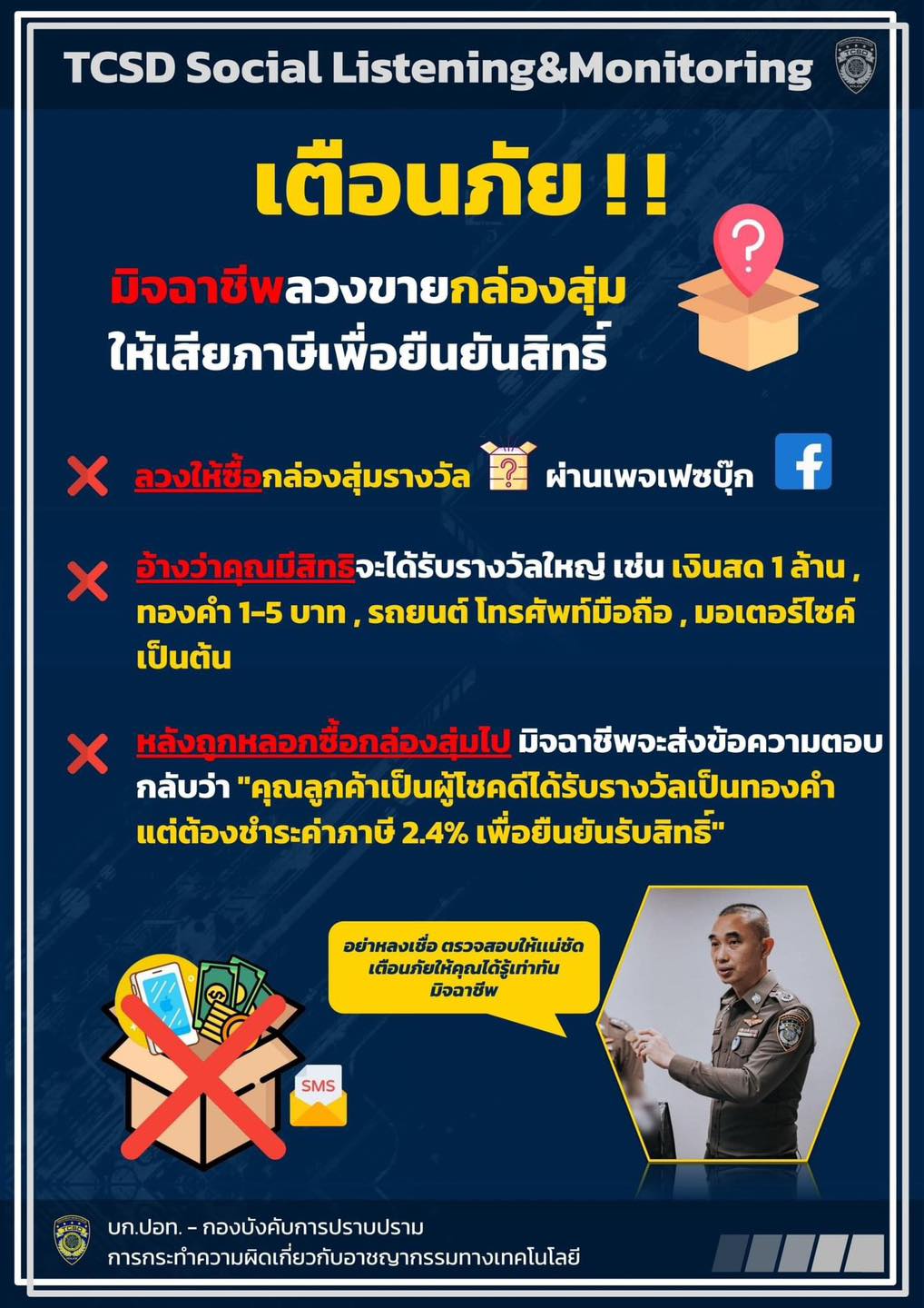 กองบังคับการปราบปรามการกระทำความผิดเกี่ยวกับอาชญากรรมทางเทคโนโลยี เตือนภัย มิจฉาชีพลวงขายกล่องวุ่มให้เสียภาษีเพื่อยืนยันสิทธิ์