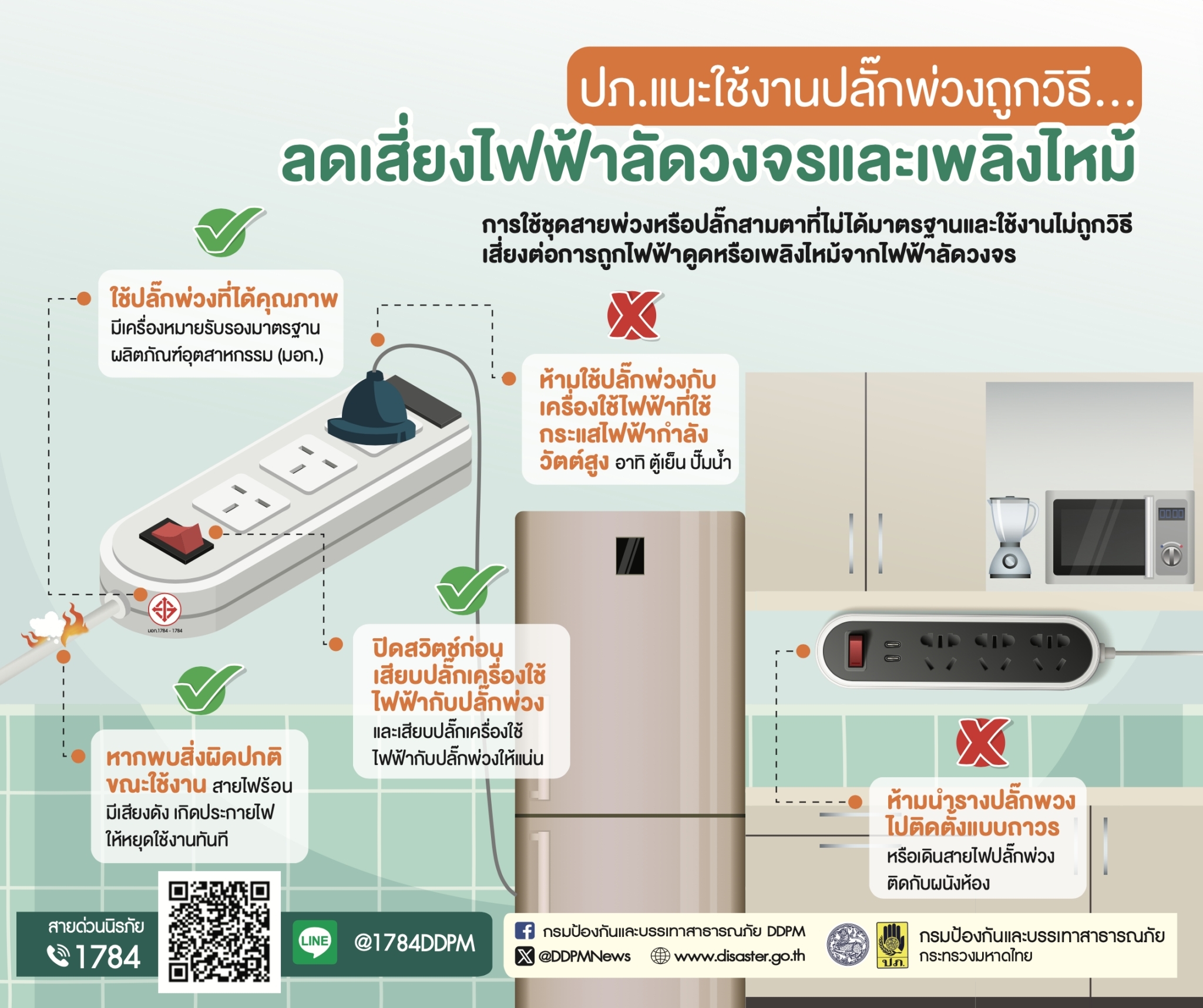 กรมป้องกันและบรรเทาสาธารณภัย แนะนำใช้งานปลั๊กพ่วงถูกวิธี ลดเสี่ยงไฟฟ้าลัดวงจรและเพลิงไหม้