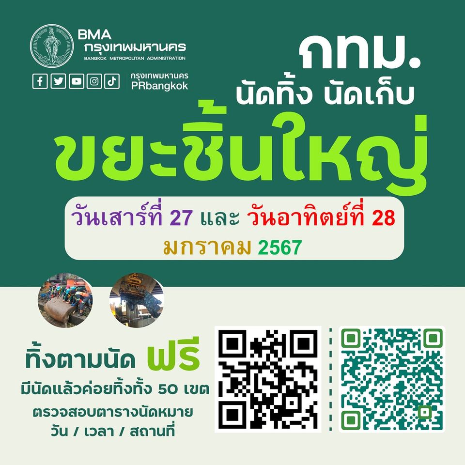 - กรุงเทพมหานคร นัดทิ้ง นัดเก็บ ขยะชิ้นใหญ่ เสาร์ – อาทิตย์ นี้ ทุกสำนักงานเขตยินดีให้บริการ ฟรีโดยไม่มีค่าใช้จ่าย