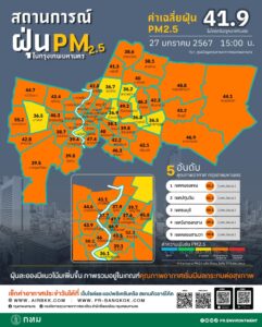 กรุงเทพมหานคร รายงานสถานการณ์ฝุ่นละออง PM 2.5 วันที่ 27 มกราคม 2567 เวลา 15.00 น.