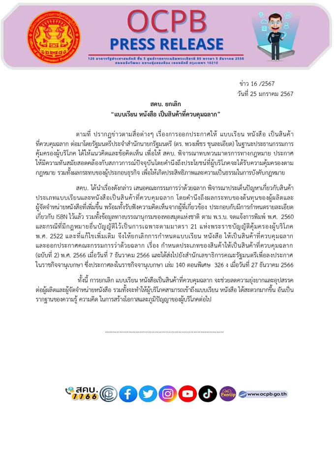 สำนักงานคณะกรรมการคุ้มครองผู้บริโภค ยกเลิก​ “แบบเรียน​ หนังสือ​ เป็นสินค้าที่ควบคุมฉลาก”