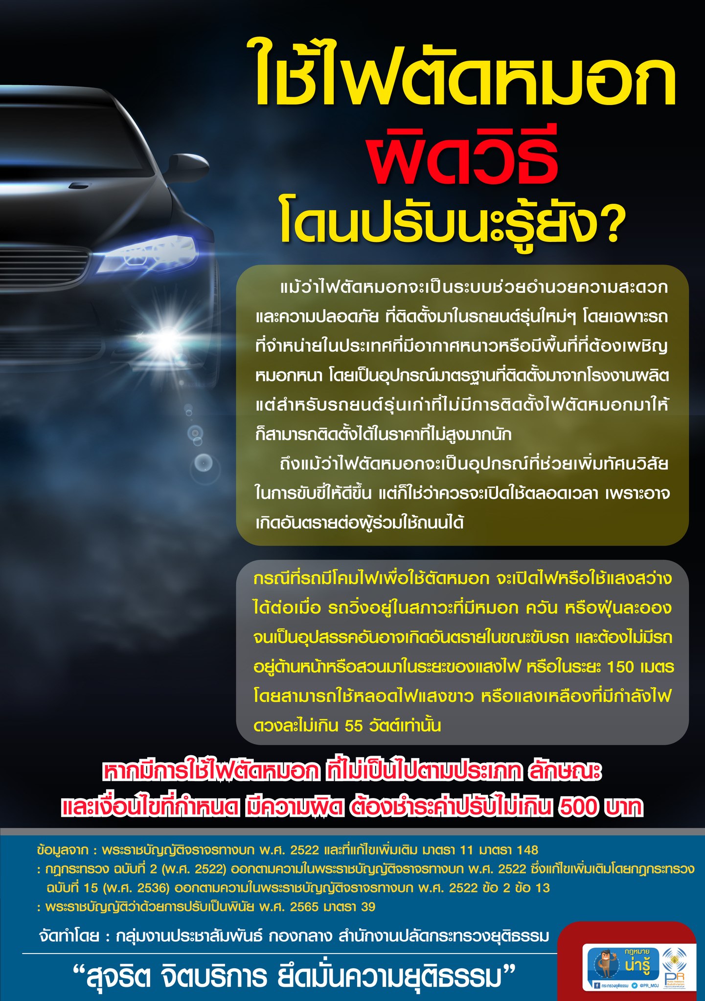 กระทรวงยุติธรรม เตือนใช้ไฟตัดหมอกผิดวิธี ต้องชำระค่าปรับไม่เกิน 500 บาท